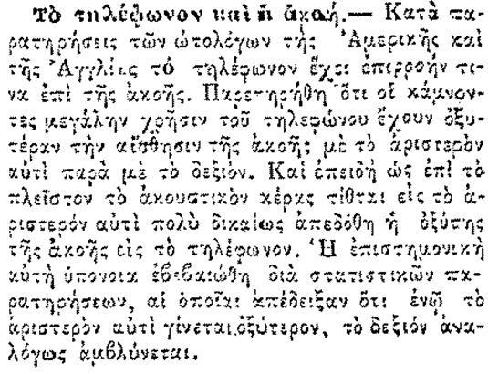 Δημοσίευμα στα τέλη του 19ου αιώνα που επισημαίνει τη διαφορά που υπάρχει για την ακοή αν βάζεις το τηλέφωνο στο αριστερό ή το δεξί αυτί…