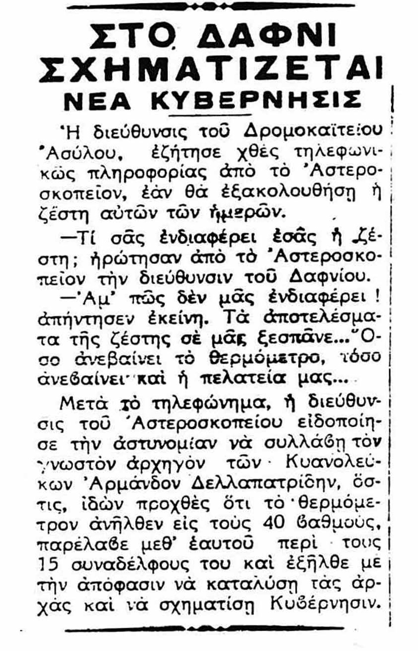 Αι μεγάλαι κωλυσιεργίαι αι θέτουσαι ανυπέρβλητον φραγμόν εις το έργον το απαρέσκον εις την αντιπολίτευση, δεν είναι δυνατόν να αναπτυχθούν με τοιαύτην ταχείαν ανάβασιν του υδραργύρου του θερμομέτρου”.