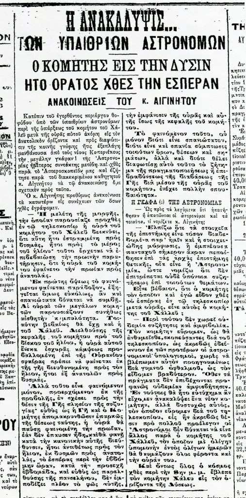 Όλοι μετατρέπονται σε ερασιτέχνες αστρονόμους και φυσικούς αναλύοντας την πορεία και τα τοξικά συστατικά της ουράς του. Την κομητοφοβία επιτείνουν οι “πληροφορίες”, που μεταλλάσσονται ταχύτατα σε βεβαιότητα και από εκεί σε πραγματικότητα και τρόμο. Χημικός, κάτασπρος από φόβο, εξηγεί ότι όταν η ουρά του κομήτη ακουμπήσει την γήινη ατμόσφαιρα θα προκαλέσει τεράστιο ηλεκτρικό σπινθήρα που θα κατακάψει τα πάντα, συμπληρώνοντας συνωμοτικά : “Έχω πάρει μαζί μου πιστόλι ώστε να μην έχω φρικτό θάνατο”. Άλλος ακούει τον ίδιο τον Δημήτριο Αιγινήτη ( διευθυντή του Εθνικού Αστεροσκοπείου Αθηνών) να λέει πως φοβάται την πρόκληση κυκλώνα στην επιφάνεια της γης που δεν θα αφήσει πέτρα πάνω στην πέτρα, ενώ κάποιοι μιλούν για επικείμενο τεράστιο σεισμό.
