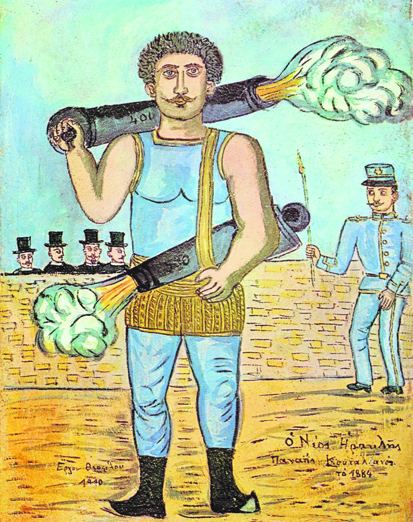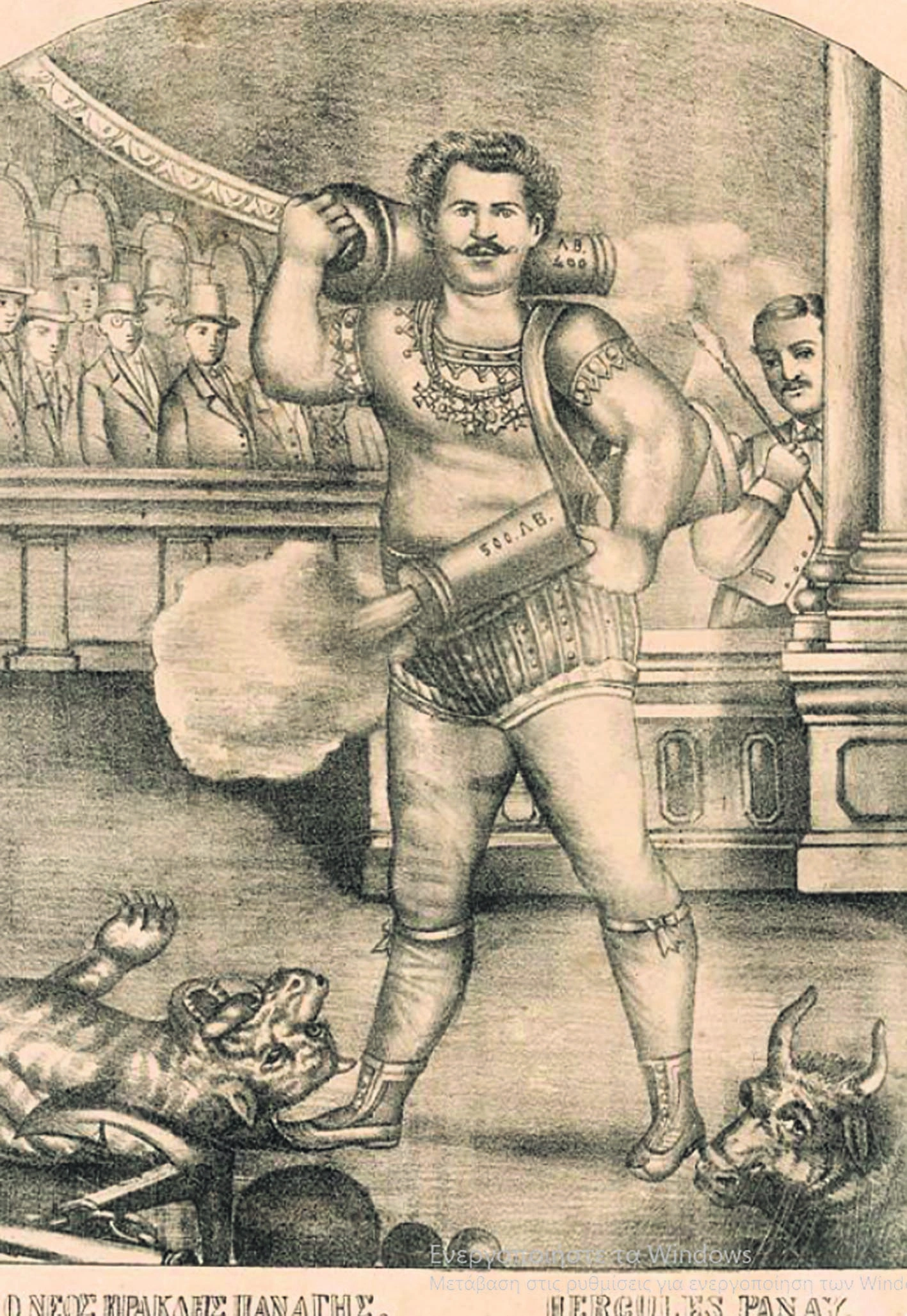 Πιο εντυπωσιακό νούμερο είναι το κουβάλημα στους ώμους δύο ή τριών βαριών τηλεβόλων (κάτι σαν τα σημερινά μπαζούκας), τα οποία κάποια στιγμή πυροδοτεί σκορπίζοντας τον φόβο στο κοινό, ενώ ο ίδιος παραμένει απαθής. Αλλες φορές αφήνονται στην αρένα τεράστια ζώα (ταύροι, τίγρεις κ.λπ.), τα οποία δαμάζει με μόνο εφόδιο τα χέρια του. Την πρώτη φορά που αυτό συμβαίνει οι Αμερικανοί διοργανωτές ρίχνουν εναντίον του, χωρίς ο ίδιος να το γνωρίζει, μία τίγρη, την οποία ο ίδιος πνίγει και έκτοτε φορά το δέρμα της στις ανά την υφήλιο παραστάσεις του.