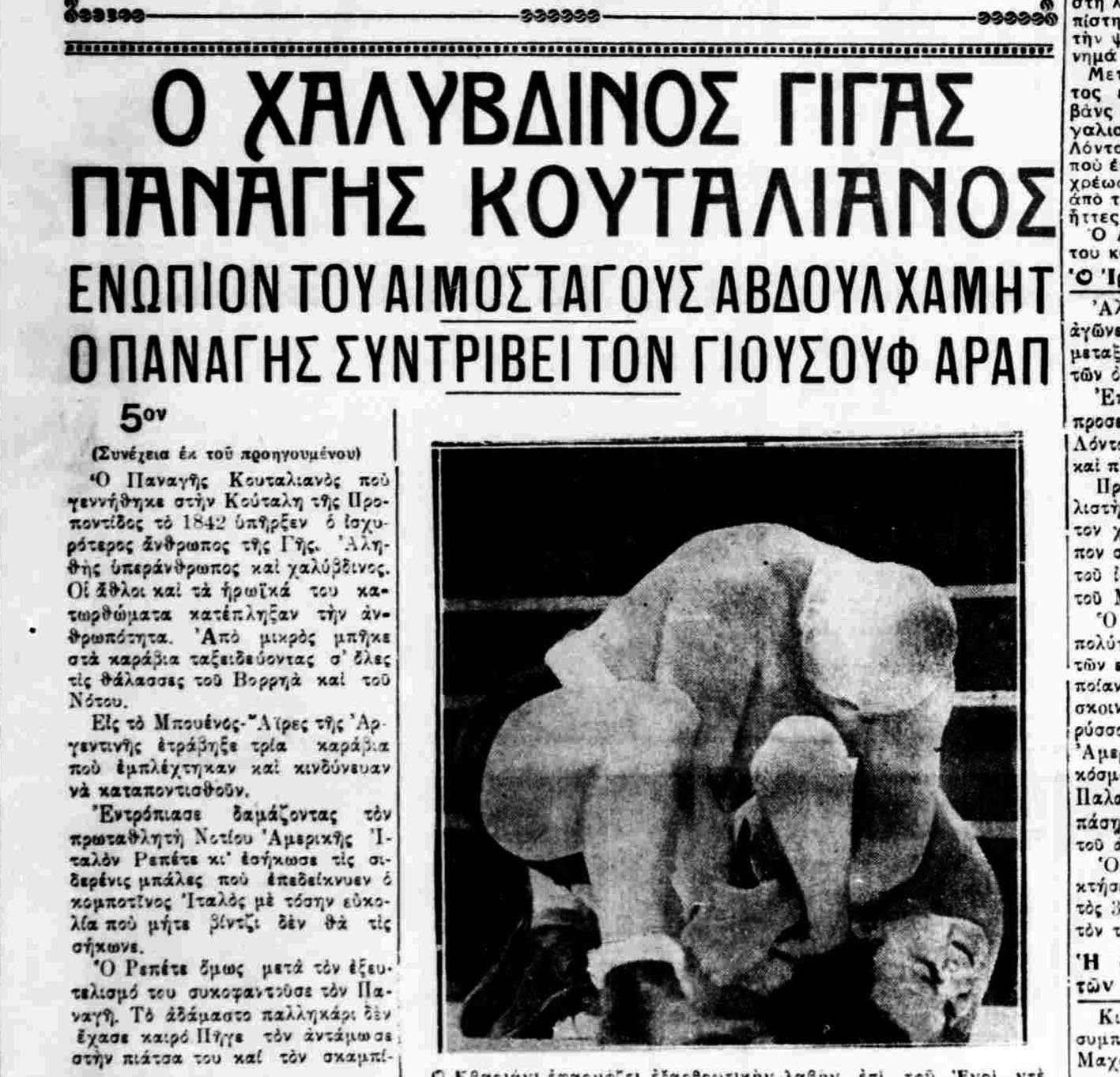 Ο θρύλος του φτάνει στην Ελλάδα, με τις εφημερίδες να εξυμνούν τα κατορθώματά του, εξάπτοντας τη λαϊκή φαντασία: «Ο Κουταλιανός εδόξασε την Ελλάδα εις όλην την Ευρώπην και την Αμερικήν ως ο δυνατότερος άνθρωπος του κόσμου. Εις Ρίο Iανέιρον της Βραζιλίας κάποτε εις μίαν αρένα, όπου έκαναν ταυρομαχίας, ενώ ο Παναγής ίστατο διά να σηκώσει ορισμένα βάρη, του απέλυσαν μία τίγρη αμερικανικήν, η οποία ονομάζεται πούμα, ήτις εισώρμησε επάνω του να τον κατασπαράξει. Αλλά ο ήρωας Κουταλιανός δεν εφοβήθη. Ορμησε επάνω της, την έπιασε από την κεφαλή και την σιαγώνα και την άνοιξε εις δυο. Υπάρχει και σήμερον εις μίαν πλατείαν του Ρίο Iανεΐρου μία οδός Παναγή Κουταλιανού, ένα άγαλμα παριστάνον έναν αθλητήν, ο οποίος είχε πιάσει την τίγρη και της είχε ανοίξει το στόμα».
