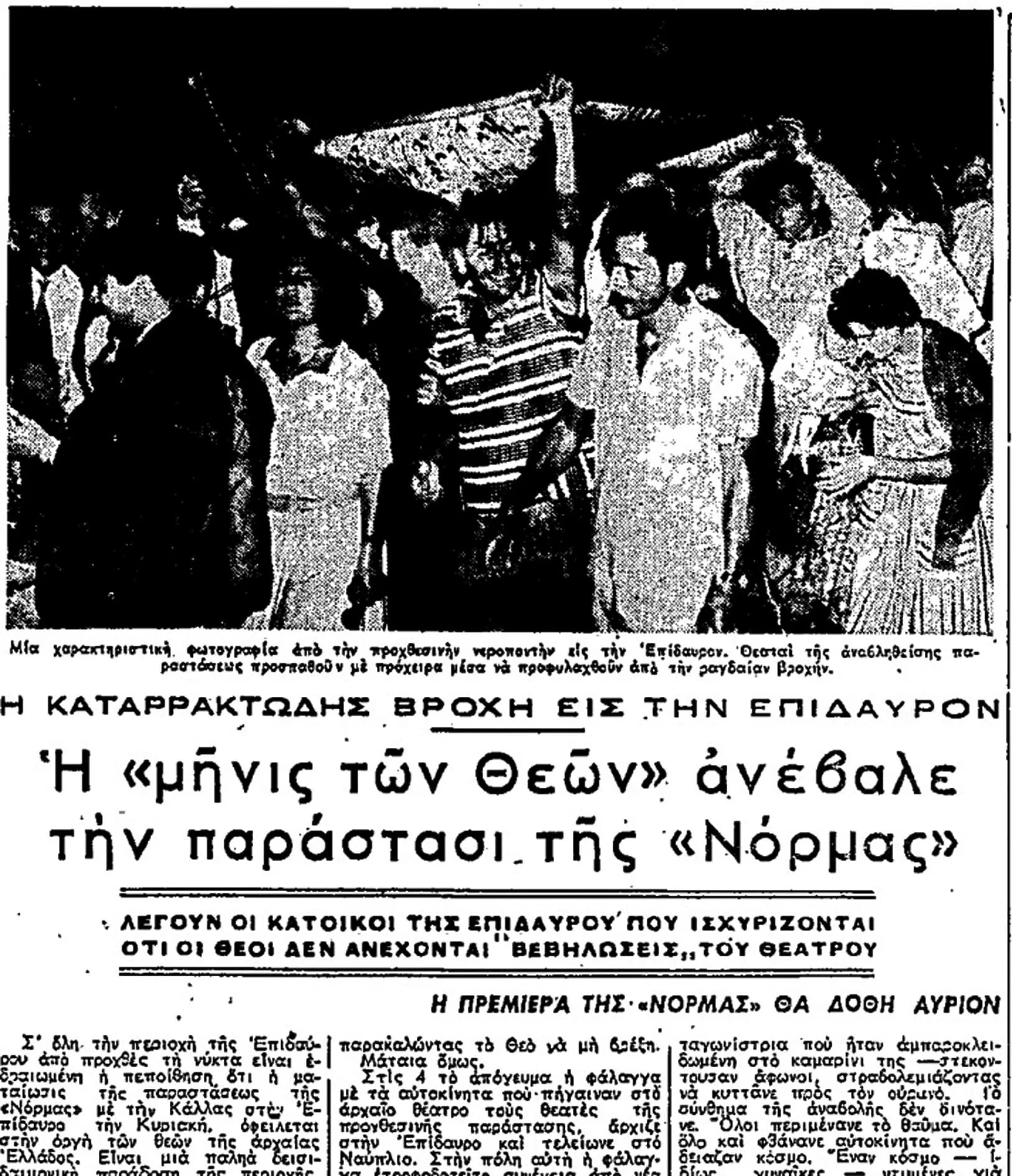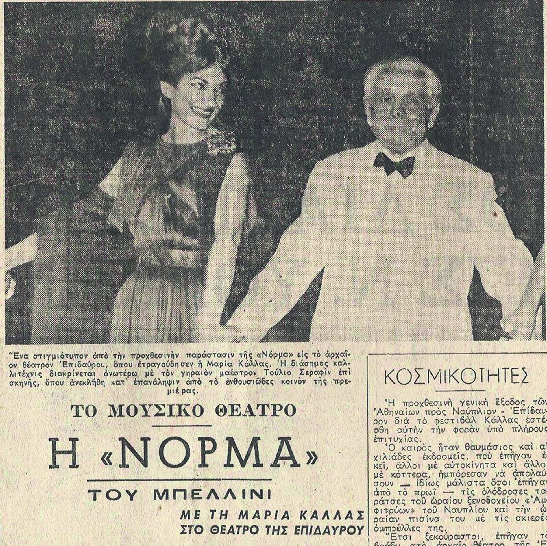 Αντίθετα, στη δεύτερη παράσταση, που είναι προγραμματισμένη για την Τετάρτη, τρεις ημέρες μετά δηλαδή, όλα μοιάζουν ιδανικά. Ο καιρός είναι καλοκαιρινός, το αρχαίο θέατρο κατάμεστο, οι επίσημοι -από τον Αριστοτέλη Ωνάση και τον Κωνσταντίνο Καραμανλή μέχρι την Αλίκη Βουγιουκλάκη και τον πατέρα της Κάλλας που έρχεται ειδικά για τη βραδιά από την Αμερική- είναι εκεί και η μεγάλη ντίβα βρίσκεται στη αρχαία σκηνή και ερμηνεύει με μοναδικό τρόπο τη Νόρμα στην ομώνυμη όπερα του Βιτσέντζο Μπελλίνι σε σκηνοθεσία του Αλέξη Μινωτή, σκηνικά του Γιάννη Τσαρούχη, κοστούμια του Αντώνη Φωκά και μουσική διεύθυνση του Ιταλού Τούλιο Σεραφίν. Αποθέωση!