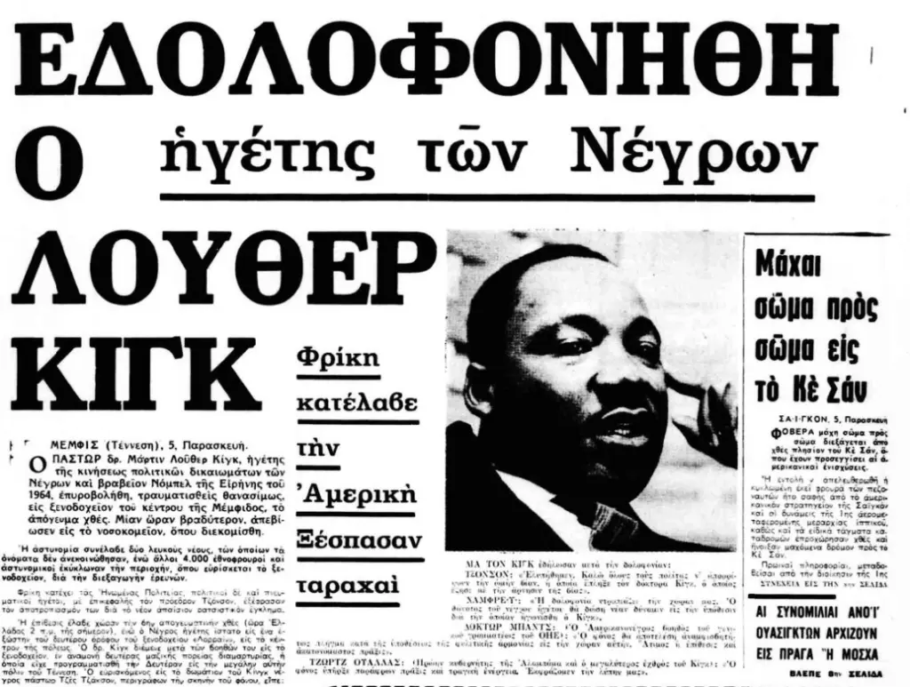 Ο Μάρτιν Λούθερ Κινγκ δολοφονήθηκε στις 4 Απριλίου 1968 στο Μέμφις, ενώ στεκόταν στο μπαλκόνι του ξενοδοχείου όπου διέμενε, προετοιμάζοντας μία ακόμη κινητοποίηση υπέρ των πολιτικών δικαιωμάτων. Ενας και μόνο πυροβολισμός ήταν αρκετός για να τερματίσει τη ζωή του και να συγκλονίσει όχι μόνο τις Ηνωμένες Πολιτείες αλλά και ολόκληρο τον κόσμο.
