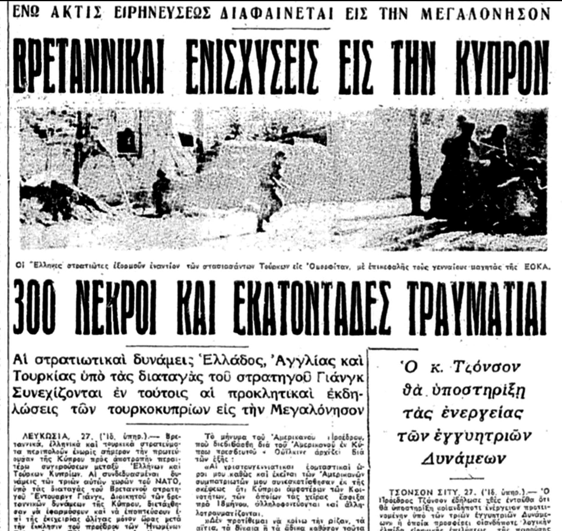 Ακολουθούν αιματηρά επεισόδια σε πόλεις και χωριά, που έχουν ως αποτέλεσμα εκατοντάδες νεκρούς, τραυματίες και εκτοπισμένους, ενώ συντελούνται πράξεις κτηνωδίας και από τις δύο πλευρές. Ο Ελληνοκύπριος πολιτικός και δημοσιογράφος Πλουτής Ζέρβας αναφέρει χαρακτηριστικά για τη φρίκη εκείνων των ημερών: «Για επτά ημέρες άγριες μάχες διεξάγονται στις τουρκικές συνοικίες. Η αφροσύνη δεσπόζει παντού, σε πλήρη συνάρτηση με τις ωμότητες. Ο Σαμψών κατακρεουργεί γυναικόπαιδα και γέροντες στην Ομορφίτα και Τούρκοι βάρβαροι εξοντώνουν τους Ελληνοκύπριους στην Τόχνη. Και επιστρέφουν ο καθένας θριαμβευτικά στις βάσεις του, ενώ τα φανατισμένα πλήθη, αμφότερων των παρατάξεων, ωρυόμενα στρώνουν δάφνες και μερσίνια για να περάσουν οι χασάπηδες ήρωες!».
