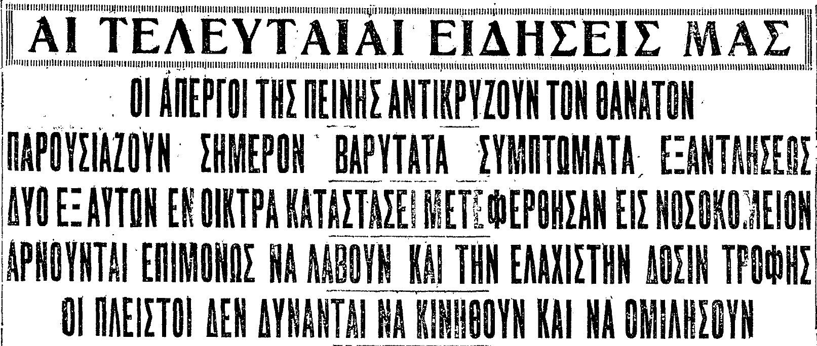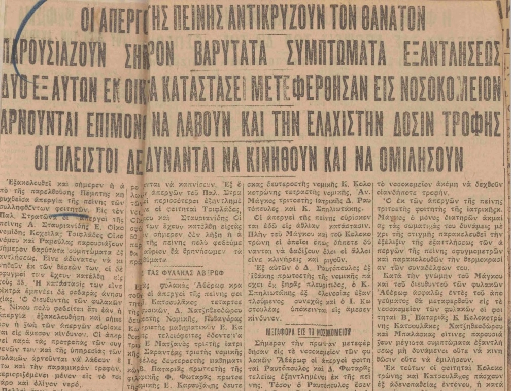 Οι εφημερίδες, κυρίως οι αντιπολιτευόμενες, δημοσιεύουν καθημερινά ρεπορτάζ για την κατάσταση της υγείας τους. «Οι περισσότεροι έχουν περιέλθει εις κατάστασιν αναισθησίας και ληθάργου μη δυνάμενοι ούτε να κινηθούν ούτε να ομιλήσουν». Πίνουν μόνο νερό και καπνίζουν ενώ διαβάζουν το μυθιστόρημα του Κνούντ Χάμσουν «Η πείνα»… Φυσικά βρίσκονται υπό διαρκή ιατρική επιτήρηση με τους γιατρούς να διαπιστώνουν βραδυκαρδία και υποθερμία. Ο εισαγγελέας Κιουρτάκης διατάζει τους διοικητές των φυλακών όταν αντιληφθούν την εξάντληση των απεργών να τους κάνουν ενέσεις φυσιολογικού ορού. Πράγματι, σε κάποιες περιπτώσεις γίνονται ενέσεις φυσιολογικού ορού καμφοράς για τόνωση της καρδιάς, ώστε να μπορούν να περπατήσουν.
