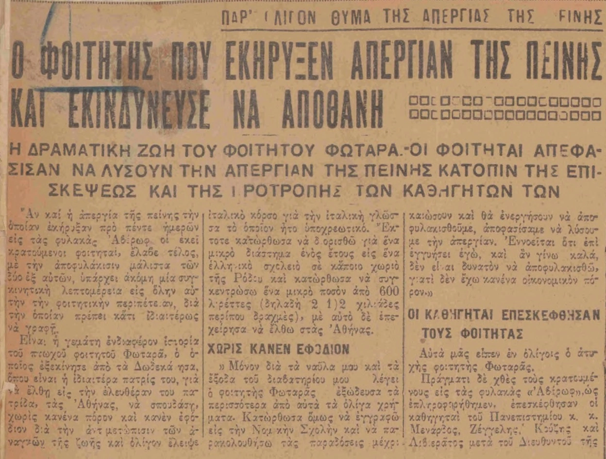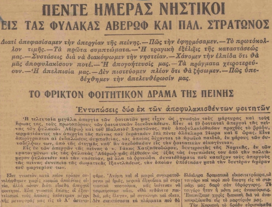 Για το τέλος αφήνουμε ένα απόσπασμα συνέντευξης ενός απεργού πείνας φοιτητή, που σε ελάχιστες γραμμές μιλά για το άλλου είδους «πτυχίο» που κατέκτησαν οι απεργοί στη φυλακή : «Αυτή η περιπέτεια μας εδίδαξε πολλά. Είναι πολύ καλύτερο Πανεπιστήμιο η Παλαιά Στρατώνα από το μεσαιωνικό Πανεπιστήμιό μας. Μαθαίνει κανείς εκεί τόσα πράγματα, μορφώνεται αληθινά. Επίσης απεκομίσαμε την εντύπωση πως οι δικαστές μας θα πρέπει να ζήσουν για 2-3 μήνες τη ζωή του φυλακισμένου, πριν γίνουν δικασταί. Έτσι θα υπάρχει ελπίς να είναι δίκαιοι κριταί των προσώπων και των περιστάσεων και να μη γίνουν ασυνείδητοι λειτουργοί».