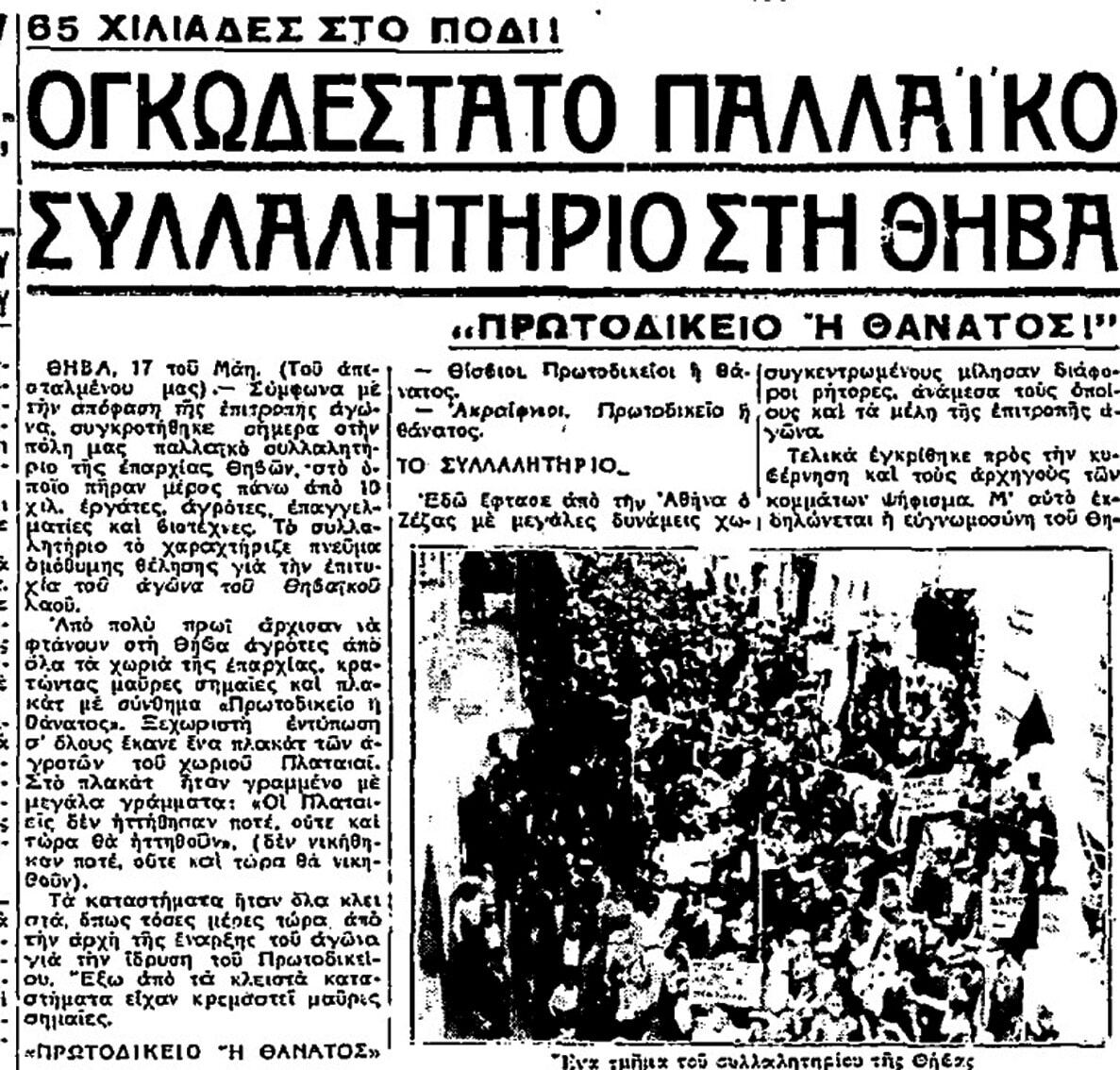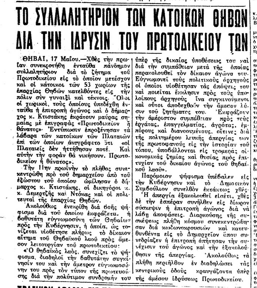 Χορτασμένοι, όμως, από υποσχέσεις, οι κάτοικοι της Θήβας όχι μόνοι ανησυχούν αλλά κλιμακώνουν τις διαμαρτυρίες τους με μια σειρά πρωτοφανών κοινωνικοποιήσεων που φτάνουν μέχρι την κήρυξη λευκής απεργίας σε όλη την πόλη. Ετσι, την Πέμπτη 14 Μαΐου 1936 η πόλη του Πινδάρου έχει εικόνα γενικής εξέγερσης. Οι καμπάνες χτυπούν πένθιμα, οι κάτοικοι βρίσκονται στους δρόμους κρατώντας πλακάτ που γράφουν «Πρωτοδικείον ή θάνατος», υπάρχει αποκλεισμός της Εθνικής Οδού που οδηγεί στην «αντίπαλη» Λιβαδειά, ενώ καταφθάνουν ενισχύσεις από τα γύρω χωριά, με καβαλάρηδες με κλέφτικες φορεσιές και μαύρες σημαίες που πυροβολούν στον αέρα…