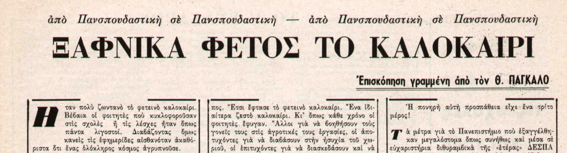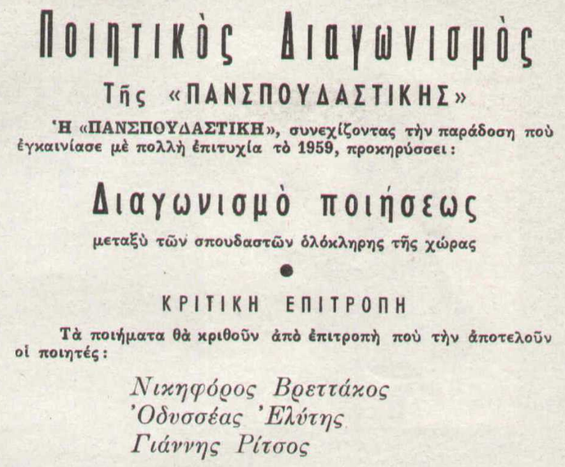 Είμαστε στο 1962 ο οργισμένος νεαρός Πάγκαλος αποτελεί μέλος της Ενιαίας Δημοκρατικής Αριστεράς (ΕΔΑ) αλλά και της Δημοκρατικής Αντίστασης Σπουδαστών (ΔΑΣ) μιας φοιτητικής οργάνωσης που διεκδικεί με ιδιαίτερα μαχητικό τρόπο τα φοιτητικά δικαιώματα. Τότε, η εμβληματική εφημερίδα των σπουδαστών “Πανσπουδαστική” διοργανώνει έναν ποιητικό διαγωνισμό τη φερεγγυότητα του οποίου διασφαλίζει η απλή αναφορά των μελών της κριτικής επιτροπής του :Οδυσσέας Ελύτης, Γιάννης Ρίτσος και Νικηφόρος Βρεττάκος.
