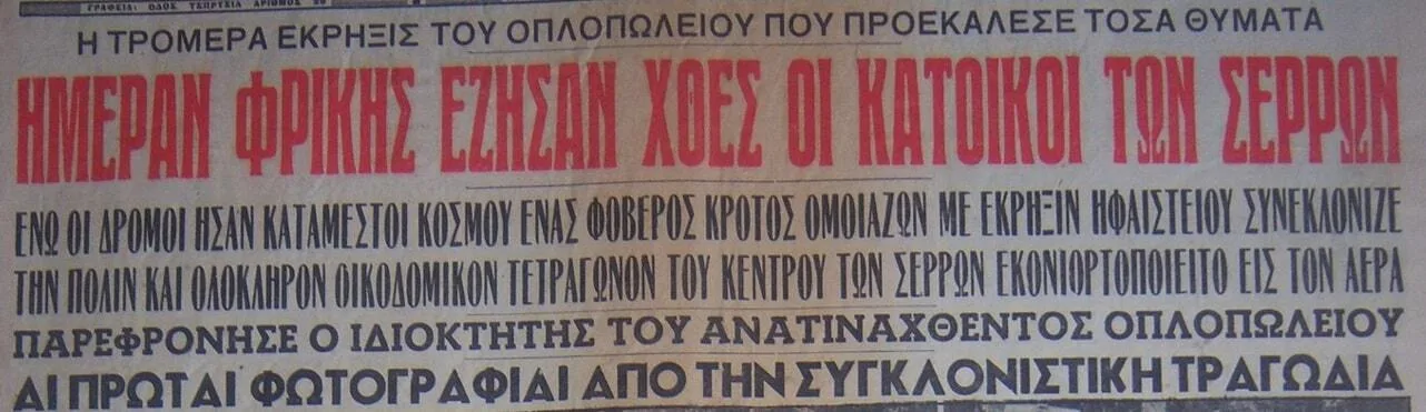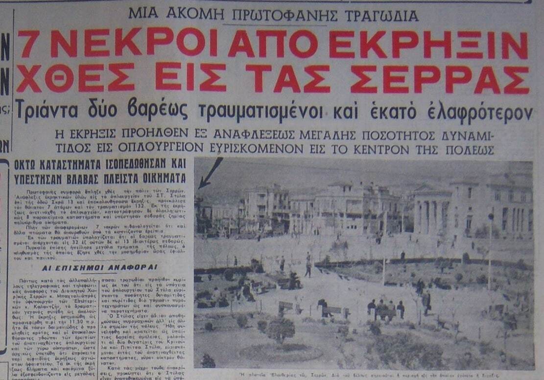 Είναι 11 το πρωί της 2ας Νοεμβρίου 1955 όταν το κέντρο της πόλης των Σερρών τραντάζεται από μια τρομακτική έκρηξη, τέτοιας ισχύος που σπίτια τινάζονται ευθύς στον αέρα ενώ ένα πυκνό σύννεφο καπνού και σκόνης καλύπτει τον ουρανό. Στις πρώτες στιγμές αλλοφροσύνης που όλοι προσπαθούν να καταλάβουν τι έχει συμβεί, ακούγονται μόνο ουρλιαχτά γυναικών και παιδιών, μαζί με απεγνωσμένες κραυγές τραυματιών που ζητούν βοήθεια, και αναζητήσεις προσώπων. Λίγη ώρα αργότερα αρχίζει να διαφαίνεται το μέγεθος της τραγωδίας.