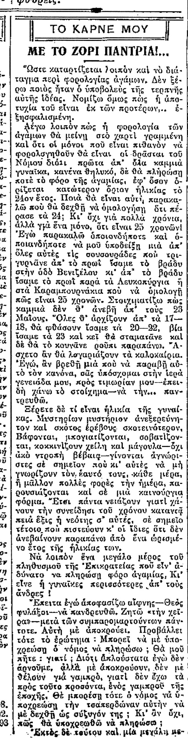 Τα εκ των αγάμων κρατικά έσοδα επανέρχονται στο προσκήνιο το καλοκαίρι του 1926 από την τότε κυβέρνηση και μετέπειτα δικτατορία Θεόδωρου Πάγκαλου, μέσω του υπουργού Οικονομικών Δημητρίου Τανταλίδη. Οι πληροφορίες ανέφεραν ότι η φορολόγηση για τους από 24 μέχρι 40 ετών αγάμους και των δύο φύλων θα έφτανε στις 3.000 δρχ. ενώ για τους άνω των 40 ετών στις 1.000 δρχ. Οι χρονογράφοι της εποχής πανηγυρίζουν για το μέτρο εκφράζοντας δημόσια τις ευχαριστίες τους σ’ εκείνον που «…επινόησε τον νέον φόρον, διά να προσφέρει ολίγην ευθυμίαν εις τους ατυχείς φορολογουμένους και ένα ευχάριστο θέαμα εις τους χρονογράφους. Εκ μέρους των τελευταίων τον ευχαριστώ εγκαρδίως».
