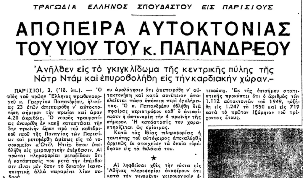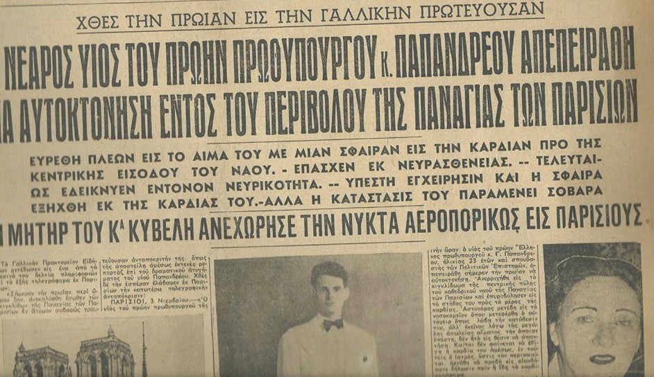 Το ελληνικό κοινό γνωρίζει μέσα από αυτό τον τραγικό τρόπο τον γιό των Γεωργίου Παπανδρέου- Κυβέλης, με τις εφημερίδες να προσπαθούν να κάνουν το ψυχογράφημα του :“Ούτω αιτία της πράξεως του φέρεται η σκληρά ερωτική απογοήτευσις η οποία έπληξε τον χαρακτήρα του υπερνευρικού, υπέρευπαθούς και υπερευαίσθητου νέου ο οποίος έπασχεν ήδη εκ διαφόρων άλλων κλονισμών. Ο νεαρός σπουδαστής περιγράφεται ως σιωπηλός, άθυμος και δύσκολος εις την επικοινωνίαν και την συναναστροφήν με τους συσπουδαστάς του και