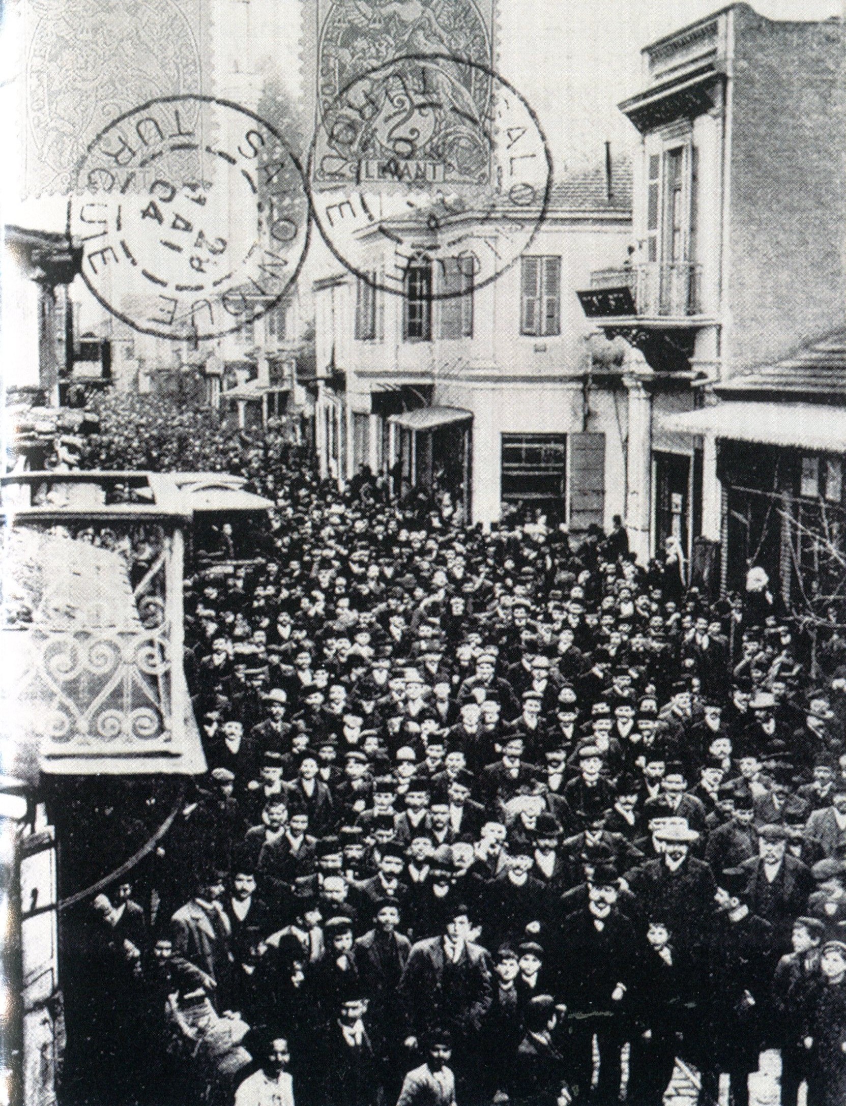 Τον Φεβρουάριου του 1885 διαδηλώνουν οι παντοπώλες «παρελάσαντες επί τεσσάρων αμαξών εκ διαφόρων της πόλεως οδών μετά μουσικών, τυμπάνων και σημαιών», ενώ το 1889 γίνεται το πρώτο συλλαλητήριο εργαζομένων στους δήμους που διαμαρτύρονται για την καθυστέρηση καταβολής της μισθοδοσίας τους :«Την πρωίαν άπαντες οι έχοντες λαμβάνειν δύο και τρεις μισθούς εργάται επολιόρκησαν τον ταμίαν του δήμου και δια φωνών και κραυγών ηπειλούν αυτόν, όπως τους πληρώσει, εις δε εξ αυτών εκμανείς πλειότερον των άλλων επετέθη δια χειρών κατά του ταμίου κ. Λούντρα», αναφέρει εφημερίδα της εποχής. Οι απάνθρωπες συνθήκες εργασίας μαζί με την αυξανόμενη επιρροή των σοσιαλιστικών ιδεών συντελούν τα επόμενα χρόνια στη μαζικοποίηση του εργατικού κινήματος, με κορυφαία έκφραση του τις αιματηρές συγκεντρώσεις τον Μάιο του 1936 στη Θεσσαλονίκη.