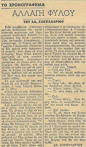 Πλέον το ζήτημα της αλλαγής φύλου εμφανίζεται δειλά στο δημόσιο διάλογο. Το 1952 ο γνωστός σκηνοθέτης, σεναριογράφος, συγγραφέας (και πολλά άλλα…) Αλέκος Σακελλάριος σε χρονογράφημα του στην “Απογευματινή” αναφέρεται σε αντίστοιχη περίπτωση Αμερικανού στρατιώτη, που χρειάζεται να κάνει έξι διαδοχικές επεμβάσεις αλλαγής φύλλου στην Κοπεγχάγη ώστε “… να μπορέσει να βγάλει τις βαριές και άχαρες αρβύλες και να φορέσει στη θέση του ένα κομψό ζευγαράκι γόβας”.