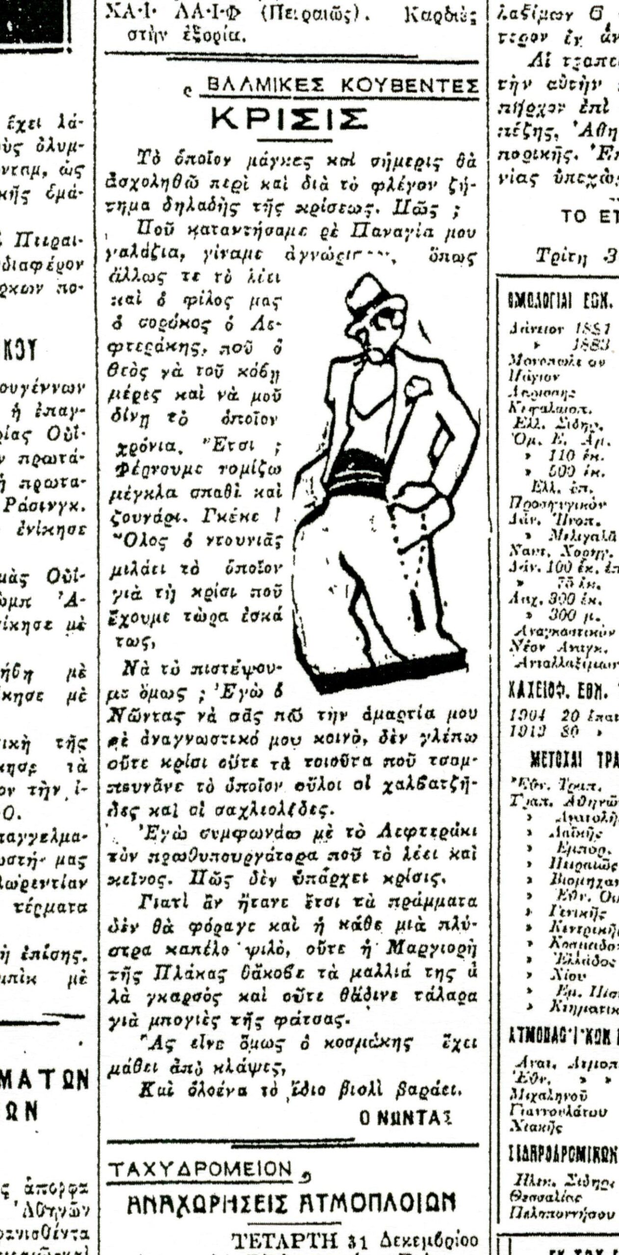 Την Πρωτοχρονιά του 1931 η γενική οικονομική δυσπραγία είναι πλέον ξεκάθαρη αγγίζοντας τα πορτοφόλια όλων, κάνοντάς τους να νοσταλγούν ήδη τα προηγούμενα χρόνια:“Με τας ημέρας αυτάς, τα πλήρεις κινήσεως, χαράς και δαπανών, καθίσταται αναντιρρήτως αισθητοτέρα παρά τω λαό ιδίως η ανάμνησις της παλαιάς καλής εποχής. Σήμερον η οικτρότης είναι γενική. Έχει ανατραπεί ο ρυθμός της ζωής μας, έχουν αναστατωθεί αι συνήθειαι”.