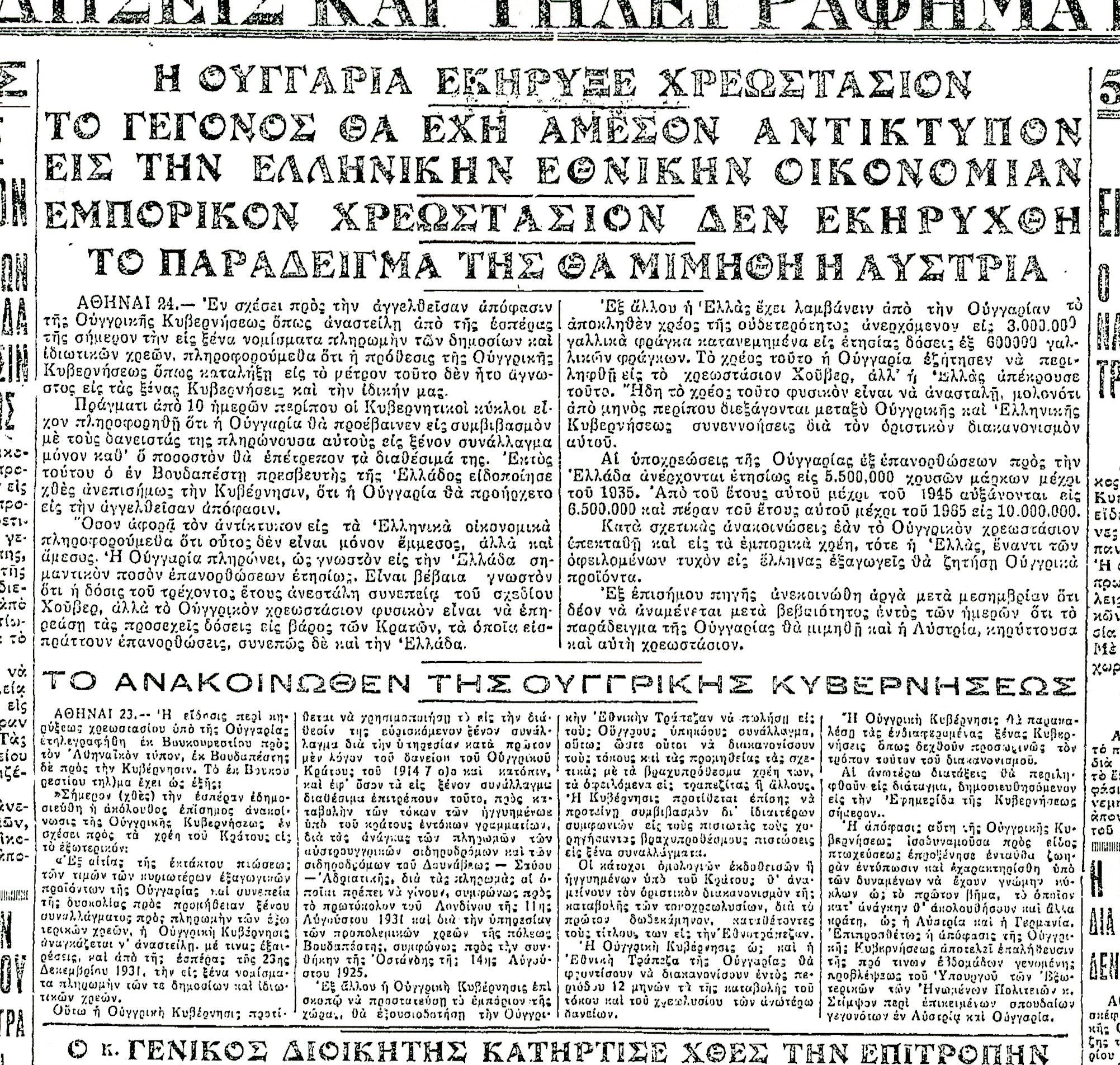 Οι γιορτές του 1931 είναι οι χειρότερες της περιόδου. Ο καταιγισμός φορολογικών μέτρων οδηγεί τη χώρα σε ύφεση, τον κόσμο σε φτώχεια και την κυβέρνηση σε σύγχυση :“Να μην πανικοβληθούμεν και εγκαταλείψομεν τα πάντα εις την τύχην. Διότι αλλοίμονον αν μας καταλάβει ο πανικός. Θα ίδωμεν την δραχμή μας να κατρακυλά και να συσσωρεύονται γύρω μας ερείπια”, γράφουν οι εφημερίδες αλλά τις τελευταίες ημέρες του χρόνου έρχεται νέα άσχημη είδηση με την χρεοκοπία της Ουγγαρίας. Αυτό πρακτικά σημαίνει πως η Ελλάδα πρέπει να “ξεχάσει” τα οφειλόμενα 3 εκατ. γαλλικά φράγκα, καθώς και τις ετήσιες υποχρεώσεις της Ουγγαρίας προς αυτήν που ανέρχονται σε 5.500 εκατ. χρυσά μάρκα μέχρι το 1935.