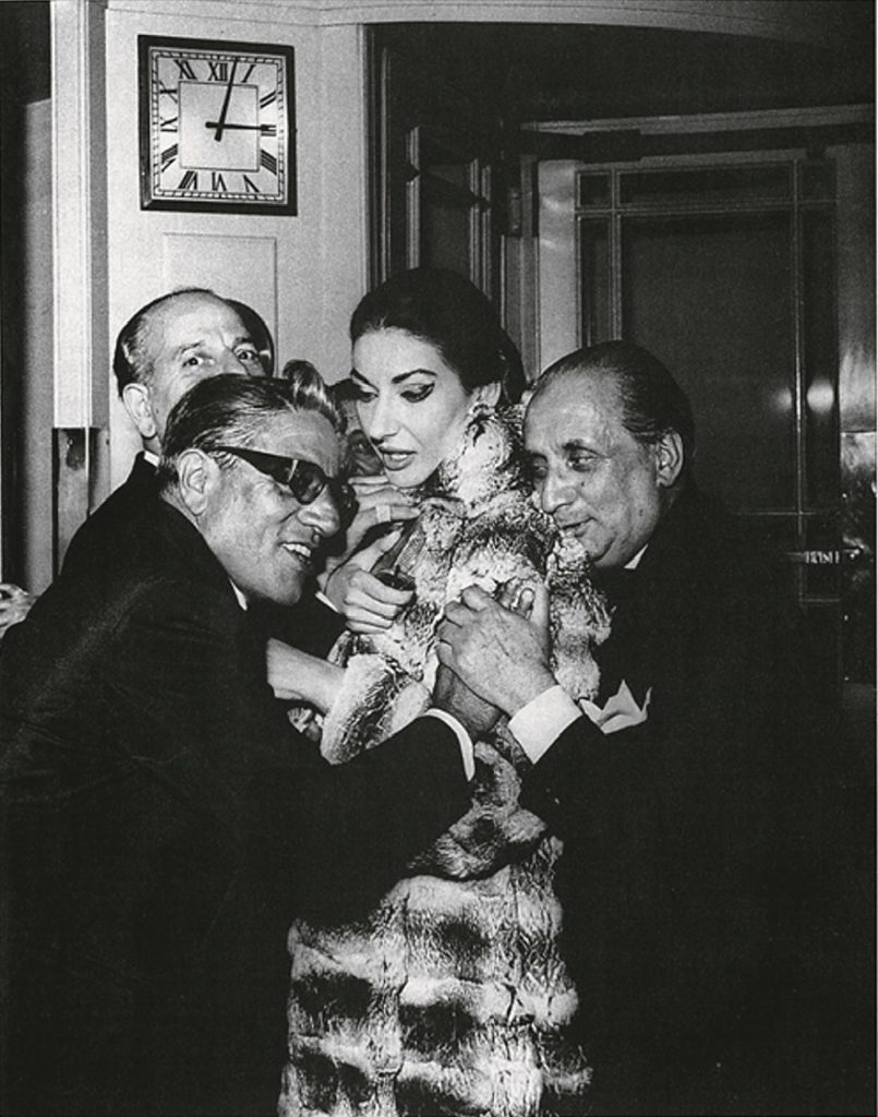 Από εκείνη την εποχή είναι η εμβληματική φωτογραφία ερωτικής διεκδίκησης οπού οι Ωνάσης-Μενεγκίνι φαίνεται να κονταροχτυπιούνται στην γούνινη αγκαλιά της Κάλλας. Είναι σε ένα πάρτι στο Λονδίνο, μετά από ένα ακόμη θριαμβευτικό ρεσιτάλ της Κάλλας, όπου ο Ωνάσης την φλερτάρει ανοιχτά μπροστά στον σύζυχό της, σηματοδοτώντας το τέλος μιας σχέσης και το ξεκίνημα μιας άλλης. Όταν η κορυφαία υψίφωνος λέει ότι λυπάται που οι μουσικοί δεν παίζουν πια μουσική ταγκό, ο Ωνάσης βάζει την ορχήστρα να παίζει μόνο ταγκό μέχρι το πρωί…