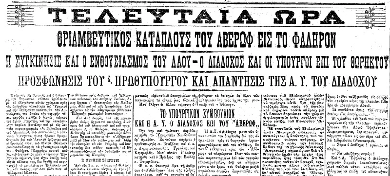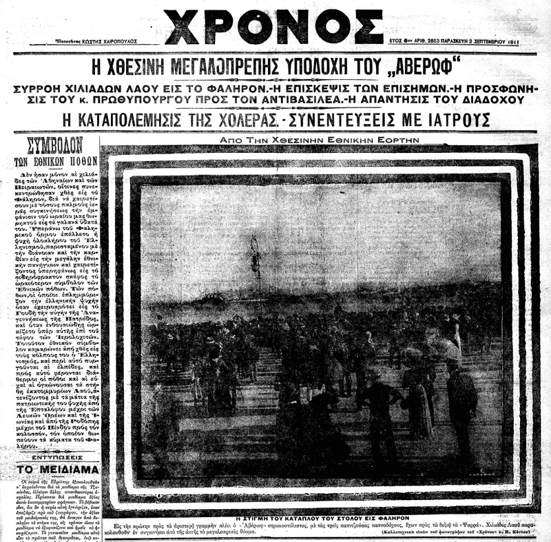 Κάτι ανάλογο είχε συμβεί και 115 περίπου χρόνια νωρίτερα, όταν το ίδιο το θωρηκτό «Αβέρωφ» έκανε την πανηγυρική του είσοδο ως το νέο «διαμάντι του στέμματος» του Πολεμικού Ναυτικού. Είναι 1η Σεπτεμβρίου 1911. Η χώρα ετοιμάζεται να υποδεχθεί το υπερσύγχρονο –για την εποχή του– θωρηκτό, το οποίο είχε αγοραστεί δύο χρόνια νωρίτερα από την Ιταλία, χάρη και στην καθοριστική οικονομική συμβολή του κληροδοτήματος του εθνικού ευεργέτη Γεωργίου Αβέρωφ. Η τελετή έχει οριστεί για τον Φαληρικό όρμο. Στην εξέδρα που στήνεται στην παραλία του Φαλήρου δίνει το «παρών» σύσσωμη η πολιτική και στρατιωτική ηγεσία του τόπου, με προεξάρχοντες τον πρωθυπουργό Ελευθέριο Βενιζέλο και τον διάδοχο Κωνσταντίνο.