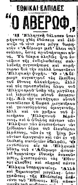 Εφημερίδα της επομένης γράφει χαρακτηριστικά: «Το θέαμα ήτο εκτάκτως μαγευτικόν και μεγαλοπρεπές. Αι λέμβοι, κυρίως με αναπεπταμένα τα ιστία, εφαίνοντο ως πεταλούδες ιπτάμεναι προς τα Εθνικά Ιδανικά, ενώ ο “Αβέρωφ”, βαρύς, ογκώδης, μεγαλοπρεπής, αναπέμπων εκ των τριών καπνοδόχων του όγκους μαύρου καπνού, επροχώρει βραδέως ως θεός της αρχαιότητος, ερχόμενος να εκδικηθεί τους εχθρούς του αγαπητού του λαού».