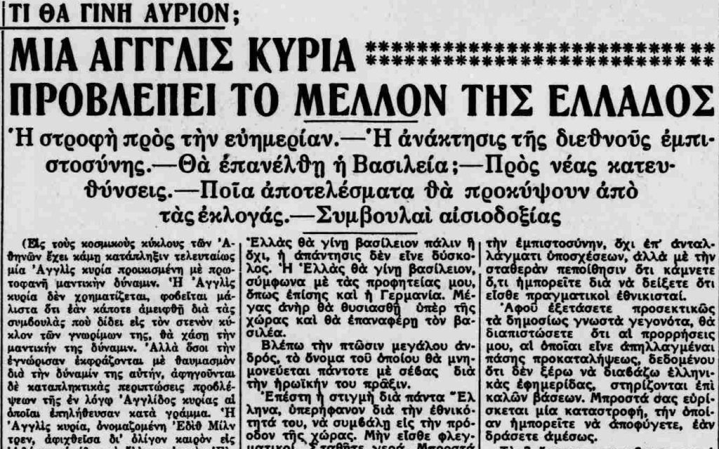 Η Έδιθ Μίλντρεν αφού ξεκινά τις προβλέψεις της λέγοντας πως “Η ευημερία έρχεται με πηδήματα”, αναφέρει ότι η χώρα βρίσκεται μπροστά σε ένα από σημαντικότερα γεγονότα της ιστορίας της. Αφού πρώτα, για την αμεροληψία των λόγων της, ξεκαθαρίζει ότι η ίδια δεν μπορεί να διαβάσει ελληνικές εφημερίδες, αναφέρει ότι η άνοδος στην εξουσία ενός νέου πολιτικού άνδρα θα μετατρέψει τη χώρα σε έναν μικρό παράδεισο :“Αι εισαγωγαί και εξαγωγαί δεν θα είναι δυνατόν να μετρηθούν. Η Ελλάς θα ευτυχίσει πάλιν και θα γίνει ισχυρόν, σεβαστόν έθνος το οποίον δεν θα χλευάζει πλέον ο άλλος κόσμος. Η αφθονία χρήματος που θα επακολουθήσει θα δώσει αμέσως ώθησην εις τας εργασίας και θα εξαφανίσει την φτώχεια”.