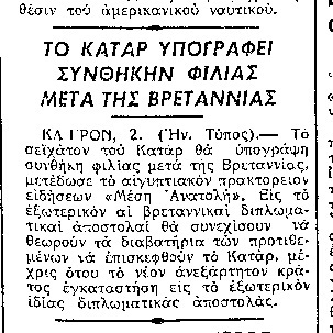Μέσα σε αυτό τον καταιγισμό ειδήσεων, ελάχιστοι παρατηρούν κάτι που περνά στα λεγόμενα “ψιλά” των εφημερίδων πιάνοντας στη καλύτερη περίπτωση δύο στήλες με ελάχιστες λέξεις: Το κρατίδιο του Περσικού Κόλπου Κατάρ, καταγγέλλει όλες τις συμφωνίες του με την Μεγάλη Βρετανία, και κηρύσσει την ανεξαρτησία του.