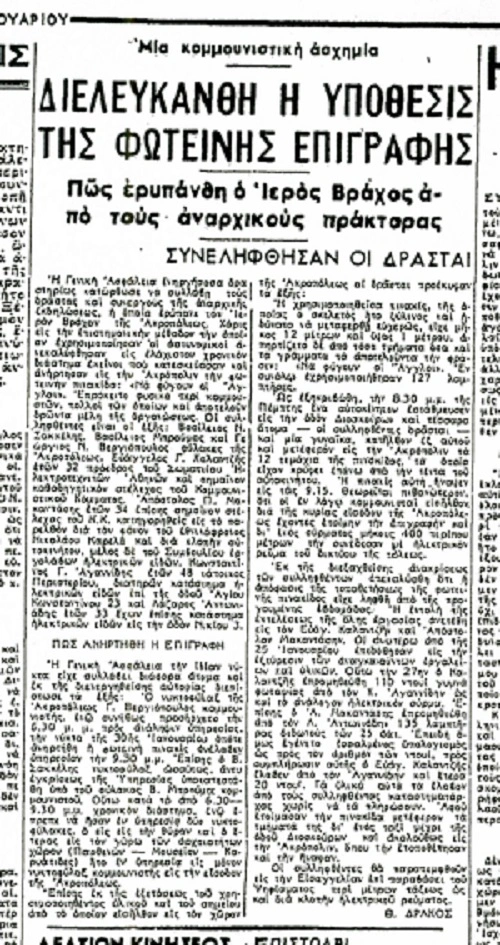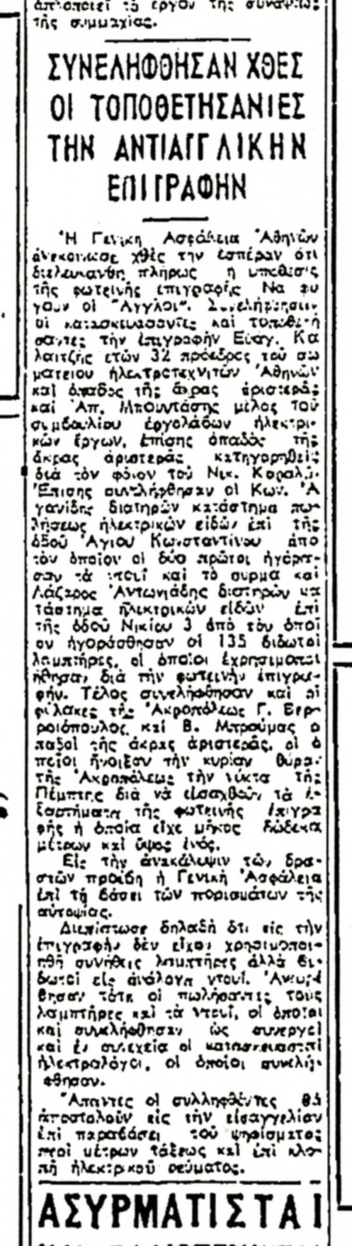Βέβαια οι εποχές δεν είναι διόλου πρόσφορες για αστεία, και την επόμενη κιόλας ημέρα συλλαμβάνονται επτά άτομα για την ενέργεια. Τρεις φύλακες του χώρου, δυο ηλεκτρολόγοι και δύο άτομα που διατηρούν κατάστημα με ηλεκτρολογικά είδη οι οποίοι μεταφέρουν τις μήκους δώδεκα μέτρων και ύψους ενός πινακίδες, με φορτηγάκι πέριξ του ιερού βράχου. Από εκεί τραβούν 400 μέτρα καλώδιο και με 110 ντουί και 135 λαμπτήρες των 25 βατ ανάβουν την φωτεινή επιγραφή. Όλοι οι συλληφθέντες –κατά την αστυνομία- είναι “σεσημασμένοι κομουνιστές” και παραπέμπονται σε δίκη για παράβαση του Ψηφίσματος περί μέτρων τάξης και για κλοπή ηλεκτρικού ρεύματος.