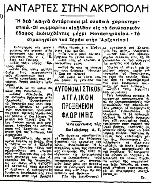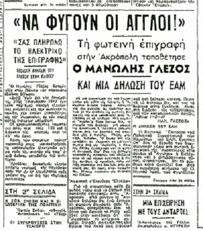 Ο “Ριζοσπάστης” των ημερών έχει κάθε λόγο να πανηγυρίζει κάνοντας χιούμορ γι αντάρτες που έχουν εγκαταστήσει το αρχηγείο τους στον Παρθενώνα : “Πραγματικά την περασμένη Πέμπτη το βράδυ, όλη η Αθήνα –και η Ελλάδα και τα Ηνωμένα Έθνη που φιλοξενούνται στο Ακροπόλ- έλαμψαν από μια φωτεινή επιγραφή που είχε τοποθετηθεί επί της Ακροπόλεως και έλεγε “Να φύγουν οι Άγγλοι”. Αυτό αρκούσε για να αρχίσουν οι κυβερνητικές δυνάμεις εκκαθαριστικές επιχειρήσεις στον ιερό βράχο ! Η δε αστυνομία εξέδωσε το κάτωθι ανακοινωθέν:“Οι συμμορίτες αποδεκατίσθησαν στην περιοχή του ιερού βράχου, τραπέντες εις φυγήν προς τα βουλγαρικά σύνορα. Ημέτερε δυνάμεις τους κατεδίωξαν μέχρι το … Μοναστηράκι. Συνελήφθησαν τα ηλεκτρικά καλώδια τα οποία διοχέτευσαν ρεύμα προερχόμενον εκ του Μπουλκές. Η επιγραφή “Να φύγουν οι Άγγλοι» εξετελέσθη επιτόπου. Ευρέθη το πτώμα της συμμορίτισσας θεάς Αθηνάς, με καταφανή σλαβικά χαρακτηριστικά. Αι επιχειρήσεις συνεχίζονται”.