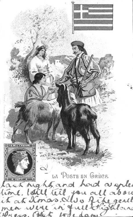 Βουκολικό επιστολικό δελτάριο στα τέλη του 19ου αιώνα που παρουσιάζει ταχυδρόμο να παραδίδει γράμμα σε βοσκοπούλες.