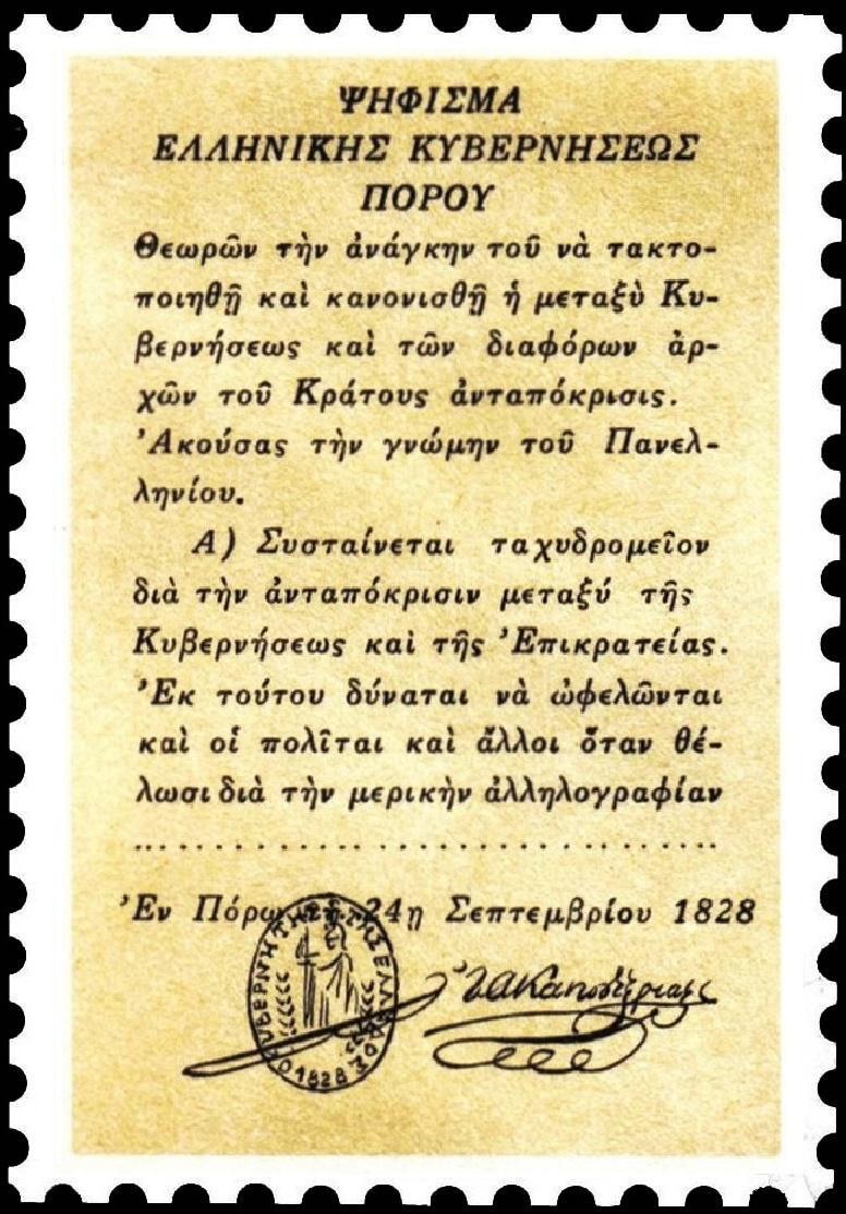 Τότε ο κυβερνήτης Ιωάννης Καποδίστριας υπογράφει ψήφισμα «περί συστάσεως τακτικής ταχυδρομικής συγκοινωνίας» δημιουργώντας έτσι το «Γενικόν Ταχυδρομείον».