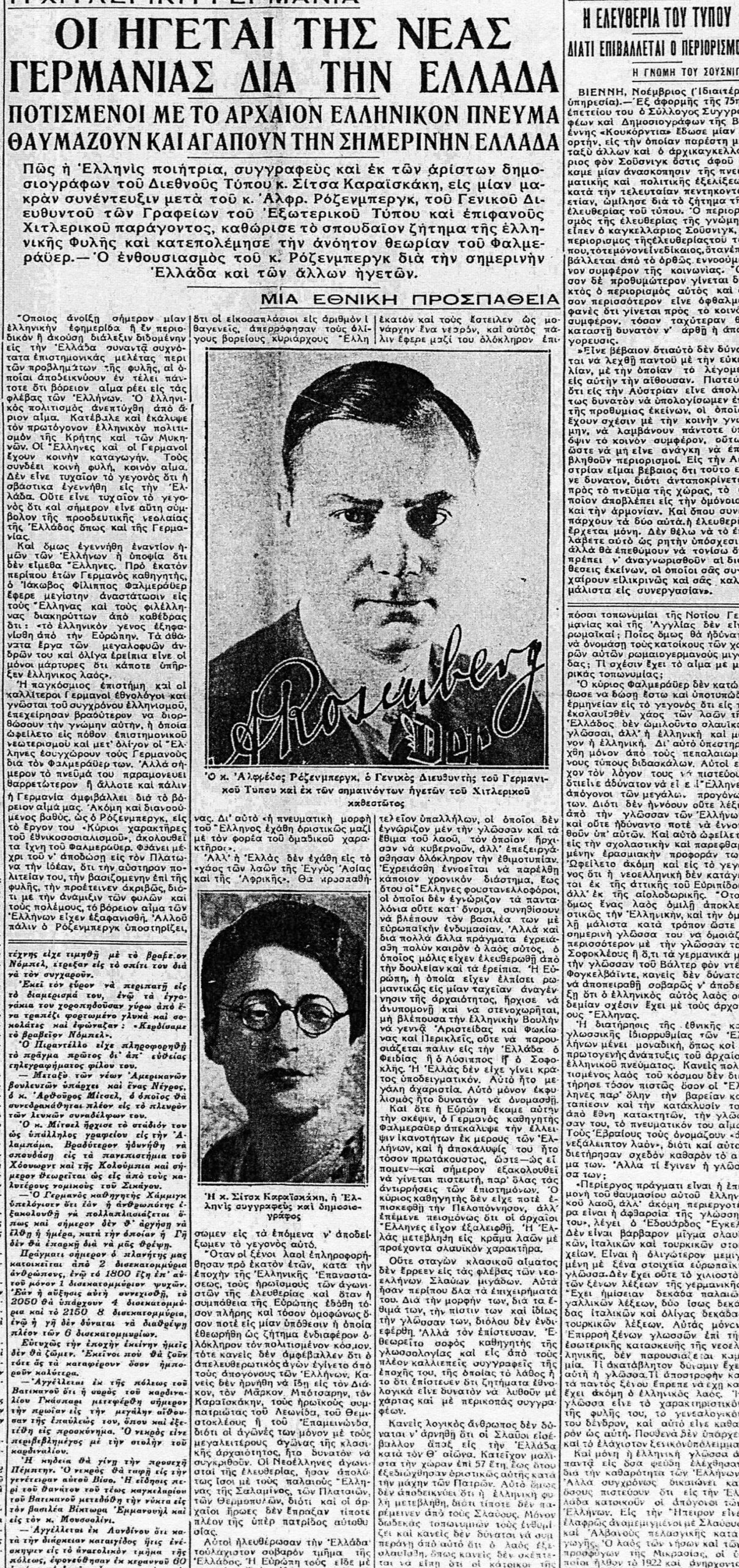 Οι σελίδες της ίδιας εφημερίδες φιλοξενούσαν συχνά διαλέξεις και άρθρα-παραληρήματα της ποιήτριας και συγγραφέως Σίτσας Καραϊσκάκη, η οποία υποστήριζε ότι ο αρχαίος ελληνικός πολιτισμός ήταν «πρωτόγονος» και αναπτύχθηκε από «άριο αίμα»: «Οποιος ανοίξει σήμερον μιαν ελληνικήν εφημερίδα ή εν περιοδικόν ή ακούσει διάλεξιν διδομένην εις την Ελλάδα, συναντά συχνότατα επιστημονικάς μελέτας περί των προβλημάτων της φυλής, αι οποίαι αποδεικνύουν εν τέλει πάντοτε ότι βόρειον αίμα ρέει εις τας φλέβας των Ελλήνων. Ο ελληνικός πολιτισμός ανεπτύχθη από άριον αίμα. Κατέβαλε και εκάλυψε τον πρωτόγονον ελληνικόν πολιτισμόν της Κρήτης και των Μυκηνών. Οι Ελληνες και οι Γερμανοί έχουν κοινή καταγωγή. Τους συνδέει κοινή φυλή, κοινόν αίμα. Δεν είναι τυχαίον το γεγονός ότι η σβάστικα εγεννήθη εις την Ελλάδα. Ούτε είναι τυχαίον το γεγονός ότι και σήμερον είναι αύτη σύμβολον της προοδευτικής νεολαίας της Ελλάδος όπως και της Γερμανίας».