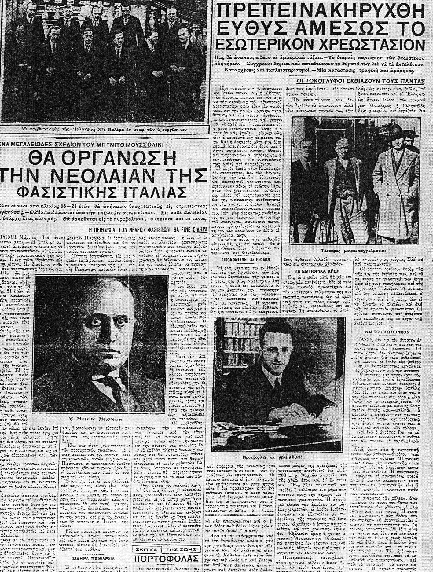 Σταδιακά όμως η αυταρχική συμπεριφορά του Μπενίτο Μουσολίνι γοήτευσε την εφημερίδα που φιλοξένησε πολλές φορές άρθρα του Ιταλού δικτάτορα. Στο ίδιο κλίμα ανήκουν πολλά δημοσιεύματα των εφημερίδων «Ακρόπολις», «Σκριπτ», «Η Βραδυνή», τα οποία εκθειάζουν τα καθεστώτα Χίτλερ και Μουσολίνι, με τους τελευταίους να προβάλλονται ως λαοπρόβλητοι ηγέτες, ικανοί να βγάλουν τις χώρες τους από την οικονομική και κοινωνική παρακμή.