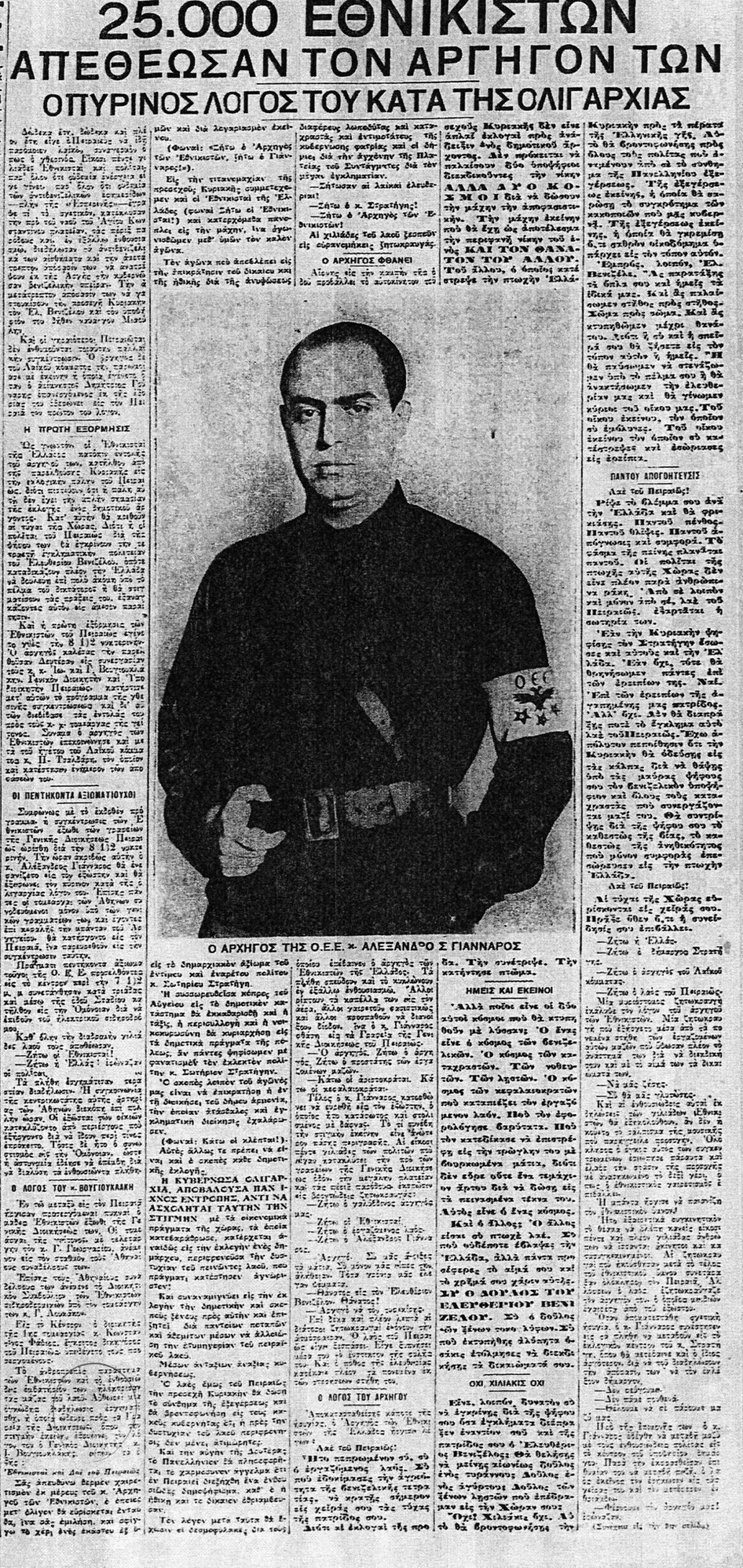 Ξεχωριστή είναι η περίπτωση του Αλέξανδρου Γιάνναρου, ηγέτη της Οργάνωσης Ελλήνων Εθνικιστών (ΟΕΕ), που μετέτρεψε την κορυφαία, κυκλοφοριακά, εφημερίδα «Εσπερινή», που έβγαζε ο πατέρας του, Πέτρος, σε όργανο του κόμματος και των φιλοδοξιών του. Ο Αλέξανδρος Γιάνναρος έκανε μέσα από τις σελίδες της πετυχημένης εφημερίδας, σκληρότατο αγώνα αρχικά κατά των Βενιζέλου-Πλαστήρα, αλλά στην πορεία κατά όλου του κοινοβουλευτικού συστήματος, που χαρακτήριζε ως ελαστικό, σάπιο, διεφθαρμένο, βουτηγμένο στα σκάνδαλα και τη σήψη, απόψεις που έμοιαζαν να δικαιώνονται μετά τη χρεοκοπία του 1932. Ο λόγος του ήταν συνεχώς οξύτερος, επιθετικός και βαθιά διχαστικός, διαμορφώνοντας μια νέα γραμμή φανατικής στράτευσης ενάντια σε κάθε τι αστικό, συντηρητικό, παρωχημένο και, κατά τη γνώμη του, αδιέξοδο.