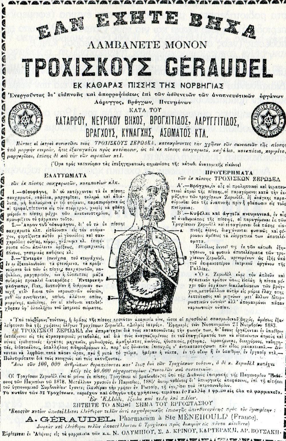Διαφήμιση αντιβηχικού το 1896 το οποίο παρασκευάζεται «Εκ καθαράς πίσσης της Νορβηγίας»….