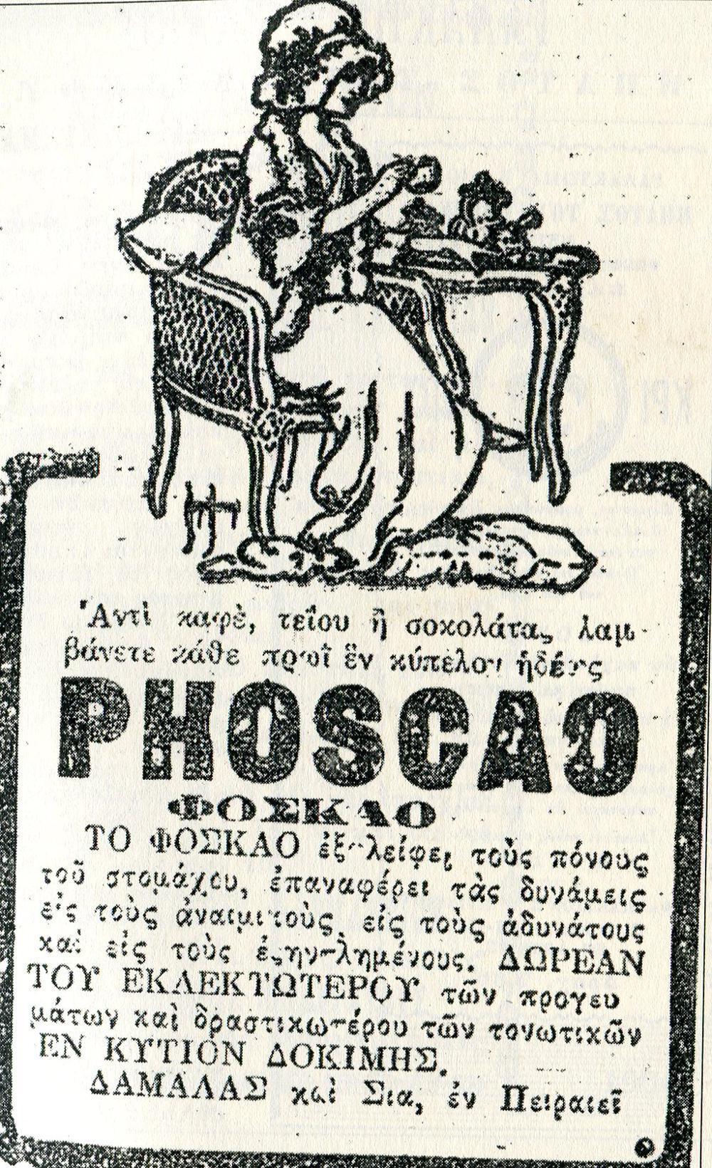 Το πρωτοεμφανιζόμενο το 1914 κακάο, παρουσιάζεται ως ρόφημα που «…εξαλείφει τους πόνους του στομάχου, επαναφέρει τας δυνάμεις εις τους αναιμικούς, τους αδύνατους και τους εξαντλημένους…».