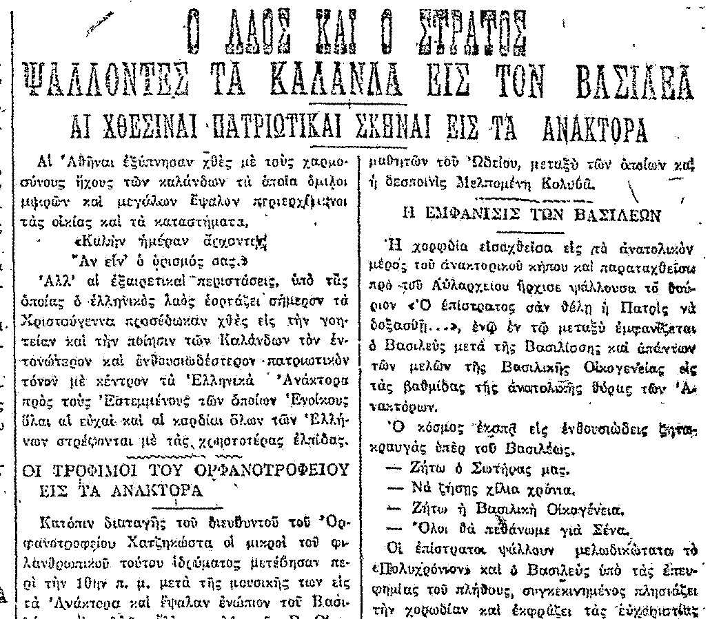 Την ίδια ώρα βγαίνουν από τα ανάκτορα οι επίστρατοι που έχουν πει τα δικά τους κάλαντα στον Κωνσταντίνο, οι οποίοι αφού ενώνονται με τους συγκεντρωμένους, κατευθύνονται όλοι μαζί στη πλατεία Συντάγματος σχηματίζοντας νέα αυθόρμητη φιλοβασιλική διαδήλωση η οποία διαλύεται έξω από τα γραφεία των φιλοβασιλικών εφημερίδων “Εσπερινή” και «Σκριπτ», αφού αποθεώνουν τους εκεί εκδότες και δημοσιογράφους…