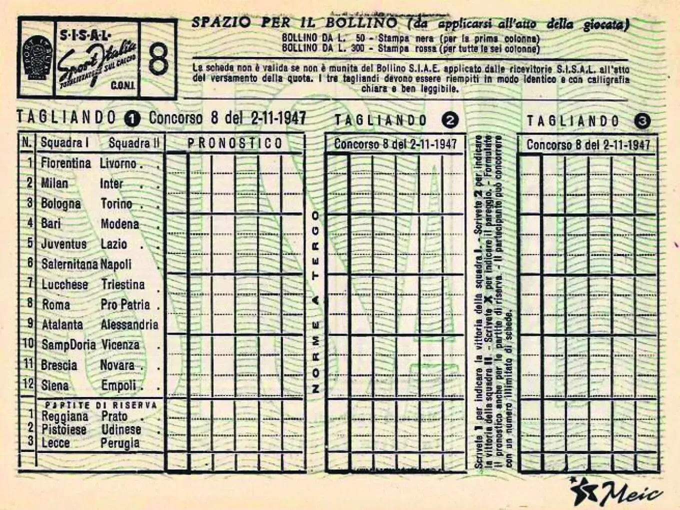 Ξεκινά επαφές με Ιταλική Ποδοσφαιρική Ομοσπονδία, Επιτροπή Ολυμπιακών Αγώνων, υπουργείο Οικονομικών, αλλά όταν δεν συναντά κλειστές πόρτες, αντιμετωπίζεται με γέλια και σχόλια του τύπου «ήρθε ο τρελός». Ενα χρόνο αργότερα μετά τις αφόρητες πιέσεις του, δίνεται τελικά η πολυπόθητη άδεια, 5 Μαΐου 1946, ημέρα που είχε επιστρέψει από το Αουσβιτς. Η συμφωνία προβλέπει ότι η εταιρία παίρνει το 12% του τζίρου, το 46% μοιράζεται στους νικητές με 11 και 12 σωστές προβλέψεις (σ.σ.: δεν υπάρχει ακόμα 13άρι), το 37% πηγαίνει στην ιταλική Ολυμπιακή Επιτροπή και το 5% στα μπαρ που τότε αποτελούν τα μοναδικά πρακτορεία.