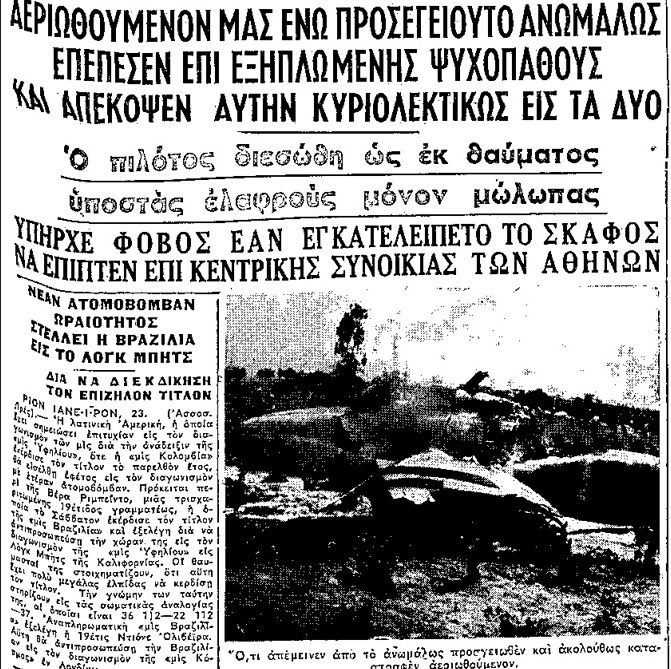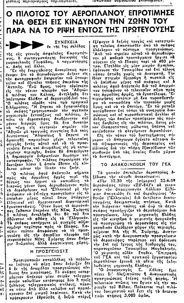 Είναι 23 Ιουνίου 1959 12.30 το μεσημέρι όταν αεροσκάφος της Πολεμικής Αεροπορίας τύπου ΡΦ–84 Φ με χειριστή τον υποσμηναγό Ευθύμιο Κόλλια απογειώνεται από το αεροδρόμιο του Ελληνικού για να εκτελέσει διατεταγμένη δοκιμαστική πτήση ρουτίνας. Δύο ώρες αργότερα, κι ενώ το αεροσκάφος προσεγγίζει το αεροδρόμιο του Ελληνικού για να προσγειωθεί, ο πιλότος διαπιστώνει μηχανική βλάβη στον κινητήρα ο οποίος σταματά. Το αεροπλάνο αρχίζει να χάνει ύψος πάνω από την Νέα Σμύρνη και ο πιλότος στέλνει σήμα κινδύνου στον Πύργο Ελέγχου Πτήσεων του Αερολιμένα Αθηνών.