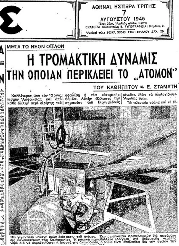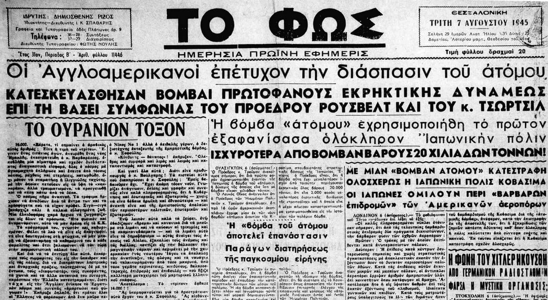Η λέξη «ατομική» κάνει για πρώτη φορά την εμφάνισή της στον ελληνικό Τύπο με τον χειρότερο δυνατό τρόπο. Το άγνωστο νέο όπλο που είχαν ρίξει οι Αμερικανοί στην Ιαπωνία δεν αποτελούσε μόνο στρατιωτικό επίτευγμα, αλλά ήταν μια αποκάλυψη τρόμου, επιστημονικής κατάκτησης αλλά και ηθικού διλήμματος.