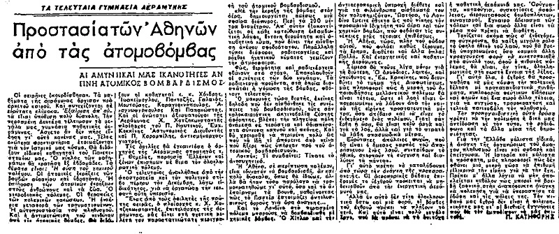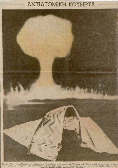 Ένα χρόνο αργότερα, το «Έθνος» παρουσίαζε σχέδια για υπόγεια κρησφύγετα και οδηγίες για το πώς θα πρέπει να ενεργούν οι πολίτες σε περίπτωση πυρηνικής επίθεσης: «Ουδείς να εξέλθη προ της συμπληρώσεως 24ώρου». Η ίδια εφημερίδα το 1953 επανέρχεται στο θέμα με τίτλο “Καταφύγια και ακτινοβολία. Η Ελλάς προετοιμάζεται”, γράφοντας για γεωγραφικές θέσεις ασφάλειας στην Αθήνα, για ελάχιστα δημόσια καταφύγια κάτω από σχολεία και νοσοκομεία.