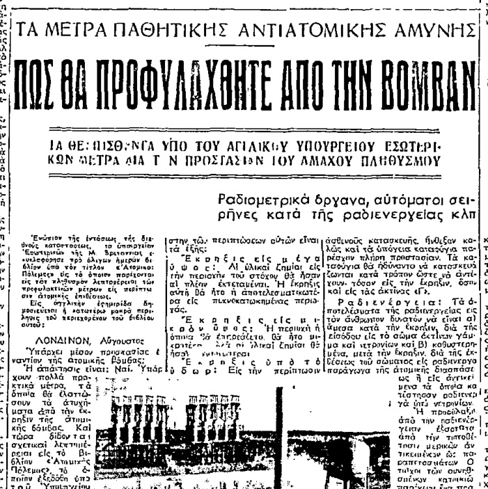 Ο πόλεμος είχε πλέον τελειώσει, αλλά ένα άλλο, αόρατο μέτωπο είχε ανοίξει: εκείνο της ραδιενέργειας. Καθώς ξεδιπλωνόταν ο Ψυχρός Πόλεμος, η πυρηνική απειλή άρχισε να αποκτά θέση στην ελληνική καθημερινότητα. Από τις αρχές της δεκαετίας του ’50, ο Τύπος ξεκίνησε να προειδοποιεί ότι η ραδιενέργεια δεν αφορά μόνο τις υπερδυνάμεις με την «Ακρόπολις να τιτλοφορεί το 1952 “Καταφύγια εις την Ομόνοιαν”.