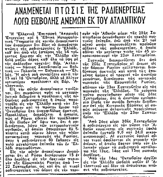 Συχνές είναι αναφορές για «βάρδιες ραδιομέτρων που ελέγχουν αέρα και χώμα» σε δήμους των βορείων προαστίων. Πυρηνικές δοκιμές της Γαλλίας στη Σαχάρα το 1957 οδηγούν σε νέα δημοσιεύματα που προκαλούν ανησυχία: «Ραδιενεργά νέφη φθάνουν έως την Ελλάδα. Τι πρέπει να ξέρει ο πολίτης», με συμπληρωματικές οδηγίες για τις δύσκολες εκείνες ώρες :κλειστά παράθυρα, ρεύμα νερού για απολύμανση φρούτων, ακόμα και κατασκευές αυτοσχέδιων καταφυγίων από μπετόν.