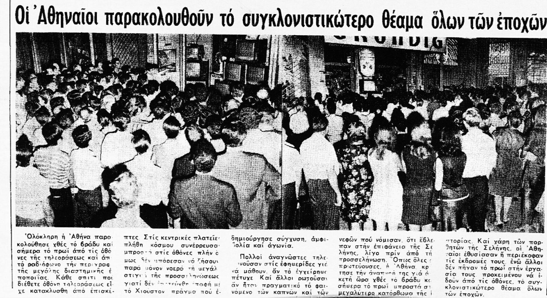Η Κυριακή αυτή είναι μια περίεργη ημέρα αφού παρότι η θερμοκρασία φτάνει σε πολλές περιοχές τους 36 βαθμούς Κελσίου, οι περισσότεροι Ελληνες δεν βρίσκονται στις παραλίες. Αντίθετα συγκεντρώνονται ανά παρέες όπου υπάρχει τηλεοπτικός δέκτης, σε σπίτια και γειτονιές, ώστε να παρακολουθήσουν από το κανάλι 11 την πρώτη απόπειρα του ανθρώπου να κατακτήσει τη Σελήνη. Το ζήτημα μονοπωλεί όλες τις συζητήσεις, με τον κόσμο να είναι διπλά έκπληκτος: «Πού έχουμε φτάσει… Θα πάμε στη Σελήνη και εμείς θα το βλέπουμε από την τηλεόραση».