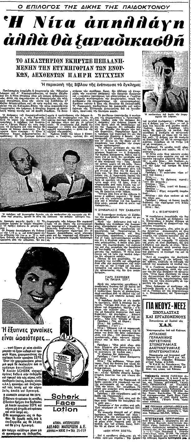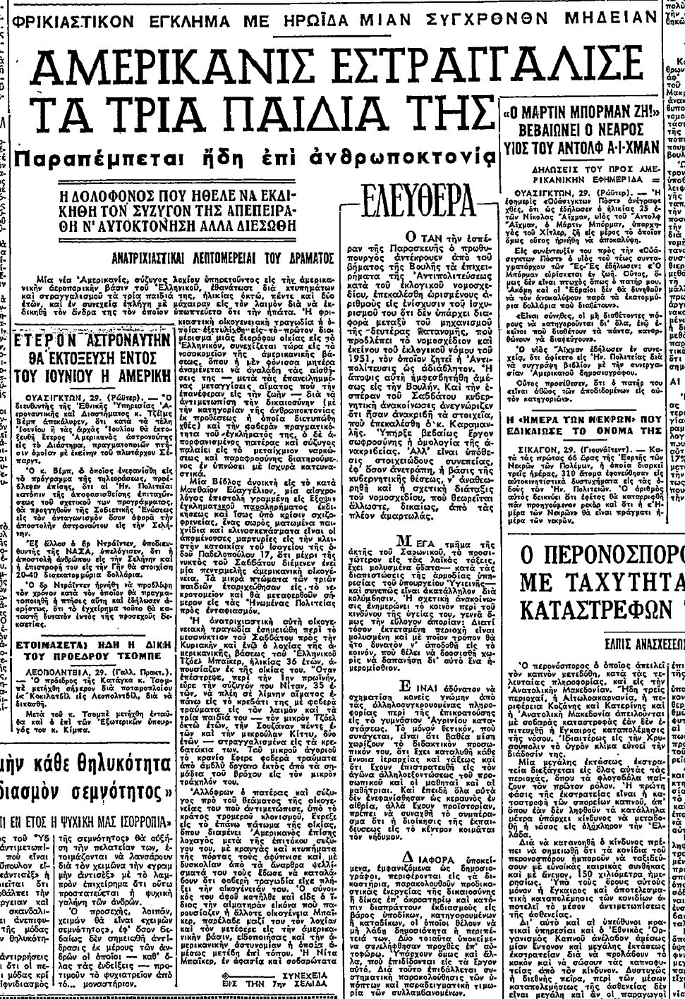 Οταν ο σύζυγός της φτάνει αργά το βράδυ και τη βρίσκει μέσα στα αίματα, τρέχει στο παιδικό δωμάτιο, όπου αντικρίζει την κόλαση… Σε κατάσταση υστερίας και με άναρθρα ψελλίσματα, τρέχει στον επάνω όροφο του διώροφου κτιρίου, όπου μένει ο συνάδελφός του, Αμερικανός λοχαγός Χάβρον. Στο σπίτι φτάνουν άμεσα ασθενοφόρα της Βάσης, που μεταφέρουν σε αφασία τη μητέρα και σε νευρικό κλονισμό τον πατέρα στο νοσοκομείο της Βάσης του Ελληνικού.
