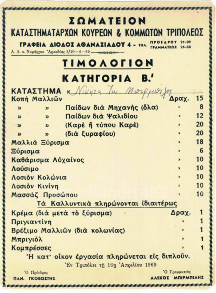 Εκείνα τα χρόνια οι κουρείς εργάζονται υπαίθρια, συχνάζοντας κοντά σε Μοναστηράκι ή Βαρβάκειο, έχοντας ως μόνα τους εφόδια ψαλίδι, χτένα, μια χάλκινη λεκάνη, λίγο ζεστό νερό και φυσικά χαμηλές τιμές: Δύο δεκάρες το ξύρισμα, τρεις το κούρεμα. Τα επαγγελματικά κουρεία βρίσκονται στο μέσον της οδού Ερμού, με εξοπλισμό δύο ξύλινους πάγκους αναμονής, δύο πέτσινα καθίσματα και χάλκινες λεκάνες οι οποίες κρέμονται στην είσοδο. Πάνω στις καλαμιές, που χρησιμοποιούν ως περίφραξη, τοποθετούν λευκές και κόκκινες πετσέτες, προειδοποιώντας έτσι τους ανυποψίαστους διαβάτες για τον κίνδυνο του συχνού αδειάσματος της λεκάνης με τα απόνερα… Συνήθως οι μπαρμπέρηδες είναι φουστανελάδες, παχύσαρκοι, με μεγάλο μουστάκι. Από τη ζώνη τους κρέμεται ένα χοντρό πετσί στο οποίο τρίβουν τα ξυράφια τους, ενώ μόλις ολοκληρώσουν την εργασία τους ρίχνουν ένα μικρό χτύπημα στον πελάτη, δείγμα ότι έχουν τελειώσει. Κυρίως στην επαρχία, ο κουρέας ασκεί και χρέη παθολόγου που κάνει αφαιμάξεις με βδέλλες αλλά και οδοντίατρου όπου εμφανίζονται οι τρομερές τανάλιες για εξαγωγή δοντιών…