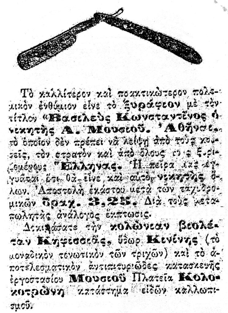 Αν νομίζετε ότι το κούρεμα αποτελεί κοινότοπη και υποχρεωτική διαδικασία, ο χρονογράφος της εφημερίδας «Εμπρός» του 1911 έχει αντίθετη γνώμη, χαρακτηρίζοντάς το με λογοτεχνικό λόγο ως «οδόφραγμα»: «Ο παρακολουθών τας τρίχας των γνωστών του ανθρώπων -μερικοί το έχουν επάγγελμα- πείθεται ότι τα κουρεία δεν είναι παρά οδοφράγματα κατά των εφόδων του χρόνου. Οι κουρείς μάλλον βάφουν παρά κουρεύουν. Η κύριά των ασχολία είναι να κόβουν άσπρες τρίχες καταδιώκοντας αυτούς τους αγγελιαφόρους του άλλου κόσμου, ως κυνηγοί, μέσα εις λόγχας, με ψαλίδια τα οποία είναι μάλλον λαγωνικά παρά εργαλεία. Συχνά εις τα κουρεία παρακολουθώ αυτήν την λυσσαλέαν ανίχνευσιν μιας μύτης ψαλιδιού πλανωμένην εις το δάσος ενός γενείου, ή πετώσαν ελαφρά πάνω από ένα μουστάκι, από το οποίον το ψαλίδι υπάγει εις το ράμφος του την άσπρην τρίχα, την αφήνει εις τον αέρα και επιστρέφει να κυνηγήσει άλλην. Κουρεύεσθαι ή ξυρίζεσθαι είναι πλέον δύο λέξεις που δεν έχουν σημασίαν. Είναι τα προσχήματα των πελατών. Η δουλειά του κουρέως είναι μία, η απάτη, επάγγελμα τρομερό και μυστικόν».