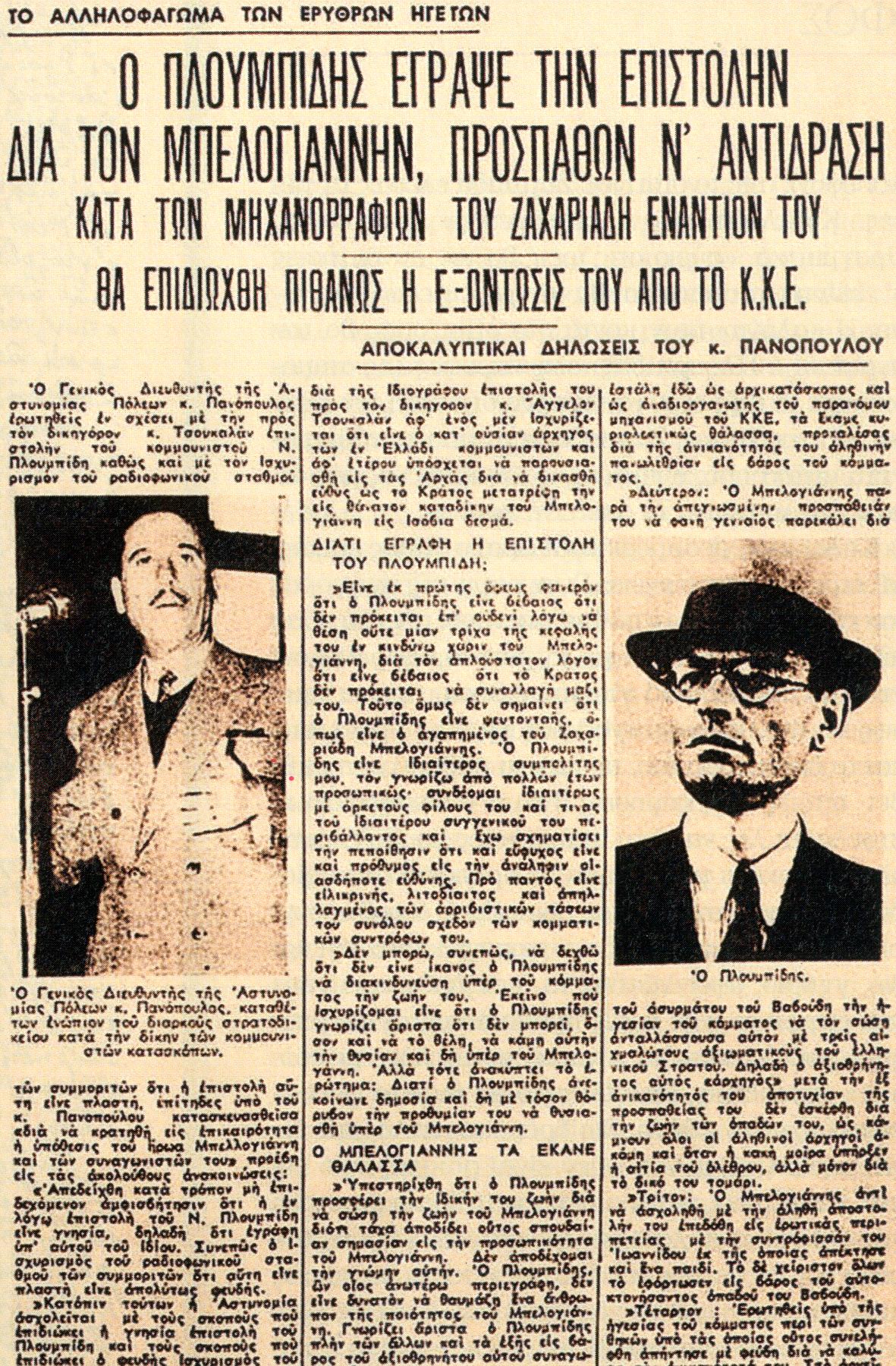Στη συνέχεια καταγγέλλει την ηγεσία του ΚΚΕ για τα πάντα: για τη θέση του στο Μακεδονικό, για την υποταγή στη Σοβιετική Ενωση και τη στάση του απέναντι στους δηλωσίες στον εμφύλιο. Επίσης, κατηγορεί την τότε ηγεσία για σταλινισμό, αφού καλεί τα μέλη του «ν’ αναγνωρίζουν ότι έχει το δικαίωμα να κατασκευάζει Πλουμπίδηδες και οι Πλουμπίδηδες όλων των εποχών να αποδέχονται αγόγγυστα τη μοίρα τους». Ας θυμηθούμε λοιπόν, ποια είναι η «υπόθεση Μπελογιάννη» που ο πρωταγωνιστής της με τον θάνατό του διχάζει ακόμα, αυτό που με τη ζωή του τόσο πιστά υπηρέτησε.