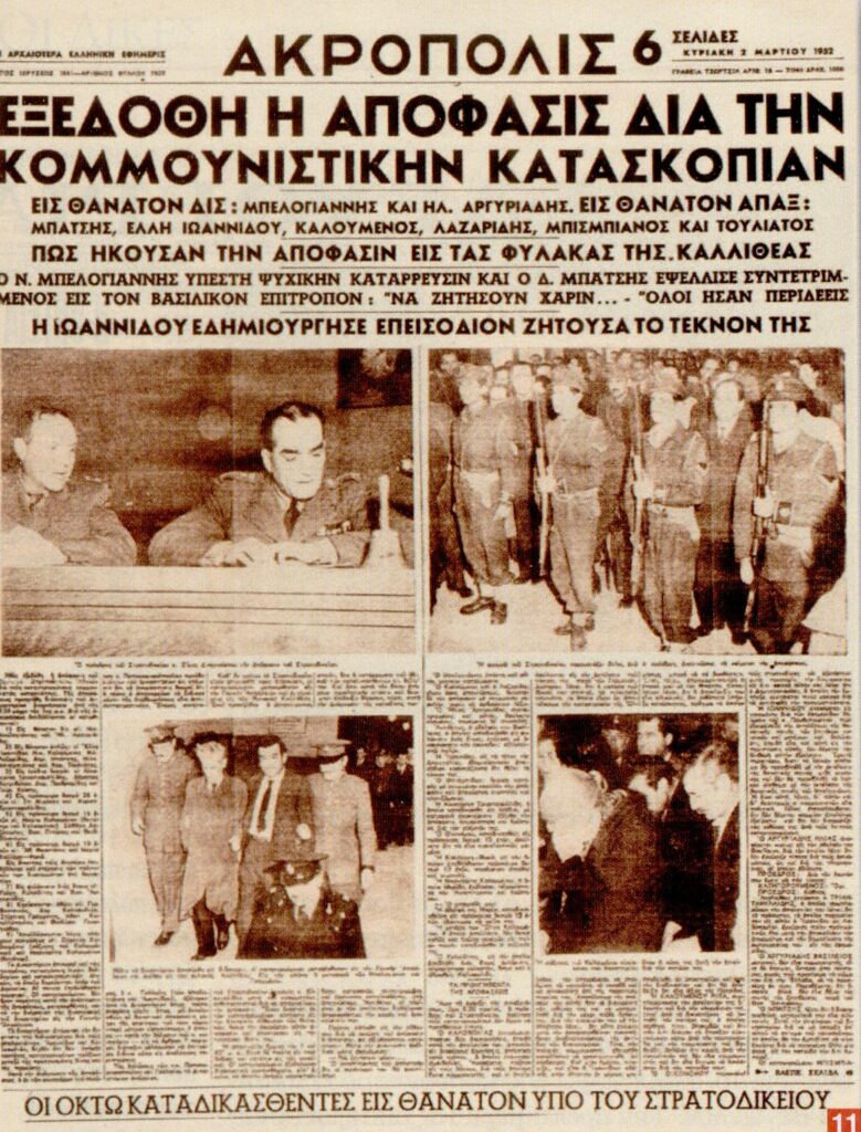 Είναι 4.10 ξημερώματα Κυριακής 30 Μαρτίου 1952, όταν πίσω από το νοσοκομείο «Σωτηρία» στο Γουδί, παίζεται η τελευταία πράξη του δράματος. Νίκος Μπελογιάννης, Δημήτρης Μπάτσης, Νίκος Καλούμενος και Ηλίας Αργυριάδης πέφτουν νεκροί από τις σφαίρες του εκτελεστικού αποσπάσματος, με την Ελλη Παππά να παίρνει χάρη την τελευταία στιγμή λόγω εγκυμοσύνης. «Οι 4 κατάδικοι εσωριάσθησαν εις το έδαφος. Ολίγας στιγμάς κατόπιν εδόθησαν εις αυτούς αι χαριστικαί βολαί. Ηκούσθησαν 12 εν συνόλω βολαί, γεγονός εκ του οποίου εξάγεται το συμπέρασμα ότι εδόθησαν τρεις εις έκαστον» αναφέρουν οι εφημερίδες την επόμενη ημέρα.