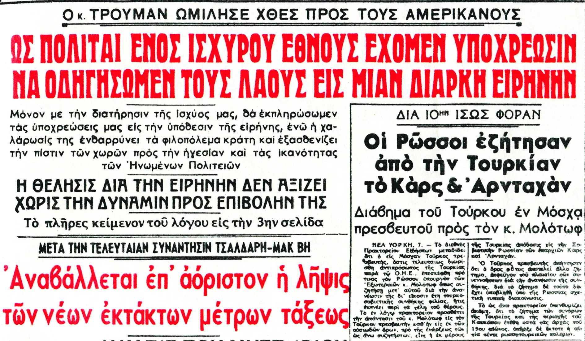 Προλαβαίνοντας αυτό το σενάριο, ο Τρούμαν, στις 12 Μαρτίου 1947, ουσιαστικά εξαγγέλλει την άμεση αμερικανική επέμβαση στην ελληνική πραγματικότητα: «Η ύπαρξη του ελληνικού κράτους απειλείται από τις τρομακτικές ενέργειες μερικών χιλιάδων ενόπλων υπό την ηγεσία κομμουνιστών, που προκαλούν την κρατική εξουσία, ιδίως κατά μήκος των βορείων συνόρων. Εν τω μεταξύ, η ελληνική κυβέρνηση αδυνατεί να αντιμετωπίσει την κατάσταση. Ο ελληνικός στρατός είναι μικρός και πενιχρά εφοδιασμένος. Χρειάζεται εφόδια και εξοπλισμό για να αποκατασταθεί η κρατική εξουσία στην ελληνική επικράτεια». Σε αυτόν τον λόγο του ο Τρούμαν παρεμβαίνει για πρώτη φορά άμεσα στα πολιτικά πράγματα της χώρας, νομιμοποιώντας την προηγηθείσα εκλογική αναμέτρηση, ενώ παράλληλα θέλει να δείξει πως θα σταθεί δίκαιος απέναντι στα οξυμένα πολιτικά πάθη: «Η ελληνική κυβέρνηση δεν είναι τέλεια, αλλά αντιπροσωπεύει το 85% των μελών του ελληνικού κοινοβουλίου, τα οποία εξελέγησαν το προηγούμενο έτος».