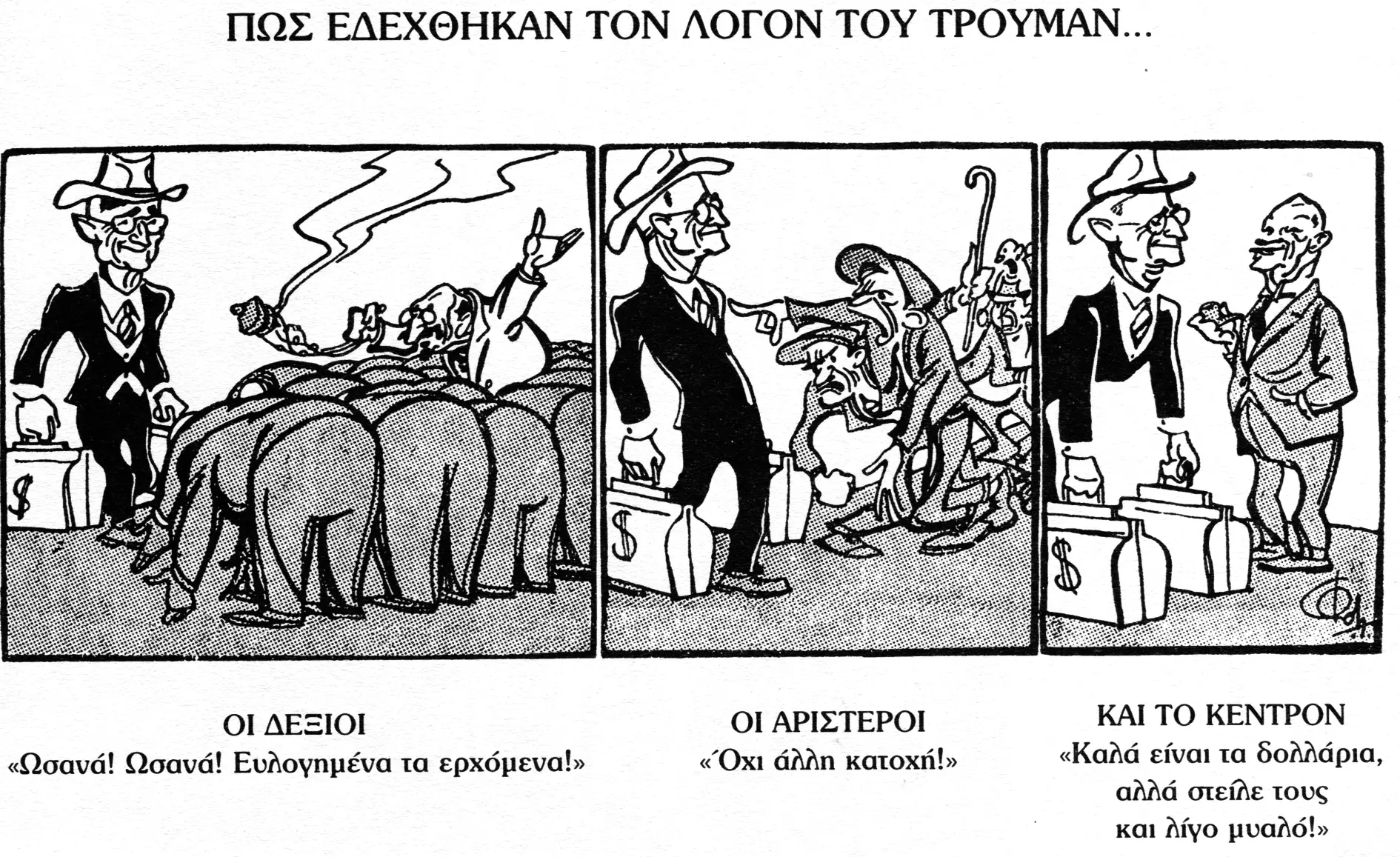 Ο προβληματισμός που εκφράζει στη Βουλή για το ζήτημα ο αρχηγός του Νέου Κόμματος, Σπυρίδων Μαρκεζίνης, δεν αφορά το αν είναι θετική η αμερικανική παρέμβαση στην Ελλάδα, αλλά το ενδεχόμενο οι Αμερικανοί να αποχωρήσουν αν δεν θεωρήσουν επικερδή τη συμμετοχή τους στα ελληνικά πράγματα: «Μπορούν να φύγουν με μεγαλύτερη ευκολία απ’ όση ήρθαν». Μην ξεχνάμε ότι τότε η χώρα είναι οικονομικά κατεστραμμένη και κάθε ξένη χρηματοδότηση πέφτει στο χώμα όπως η βροχή στην ξερή γη. Κατά της βοήθειας τάσσονται η Σοβιετική Ενωση και η Αριστερά, που θεωρούν αυτά τα χρήματα εξαγορά της ελληνικής κυβέρνησης από τον αμερικανικό παράγοντα.