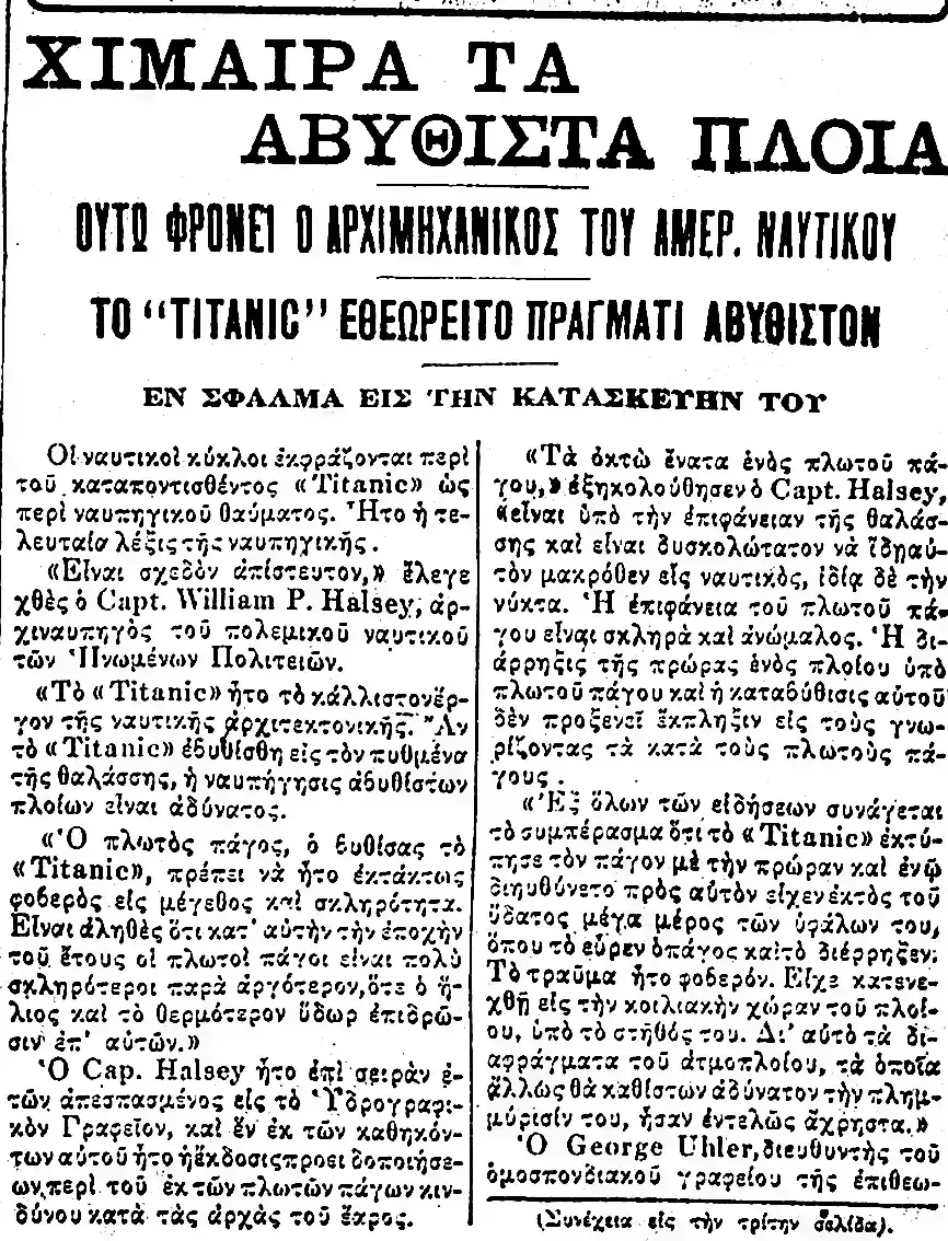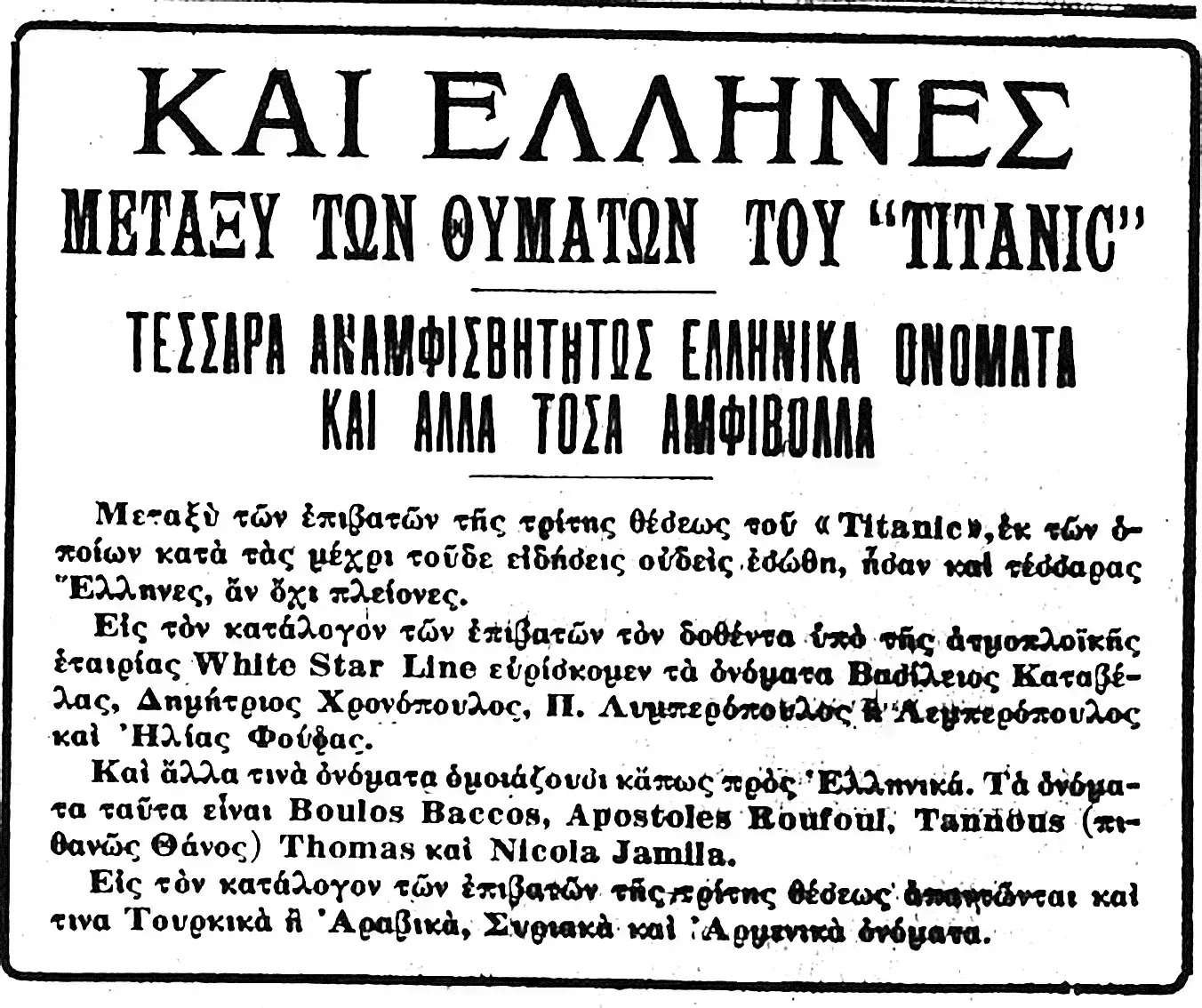 Αρχικά να επισημάνουμε ότι ενώ το ναυάγιο συμβαίνει στις 15 Απριλίου 1912 οι ελληνικές εφημερίδες κάνουν τις πρώτες δημοσιεύσεις τους με ημερομηνίες 5-6 και 7 Απριλίου, αφού η χώρα δεν έχει υιοθετήσει ακόμα το Γρηγοριανό ημερολόγιο.