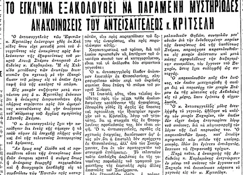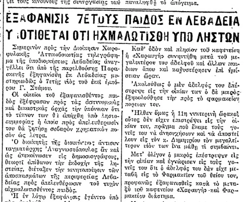 Οι ανάστατοι γονείς το αναζητούν αρχικά σε φίλους, μετά σε συγγενείς και καταλήγουν ψάχνοντας σε ποτάμια, πηγάδια και αποθήκες της περιοχής. Κινητοποιείται η Χωροφυλακή υπό το φόβο συμμοριών που λυμαίνονται ακόμα πολλά σημεία της χώρας. Το πρώτο νέο έρχεται την επόμενη ημέρα με γράμμα στους γονείς που αναφέρεται για απαγωγή και ζητά 800.000 δρχ ως λύτρα, ποσό τεράστιο για εποχή : «Το παιδί είναι καλά, αλλά θα γυρίσει μόνο αν κάνετε ότι σας πουν.»
